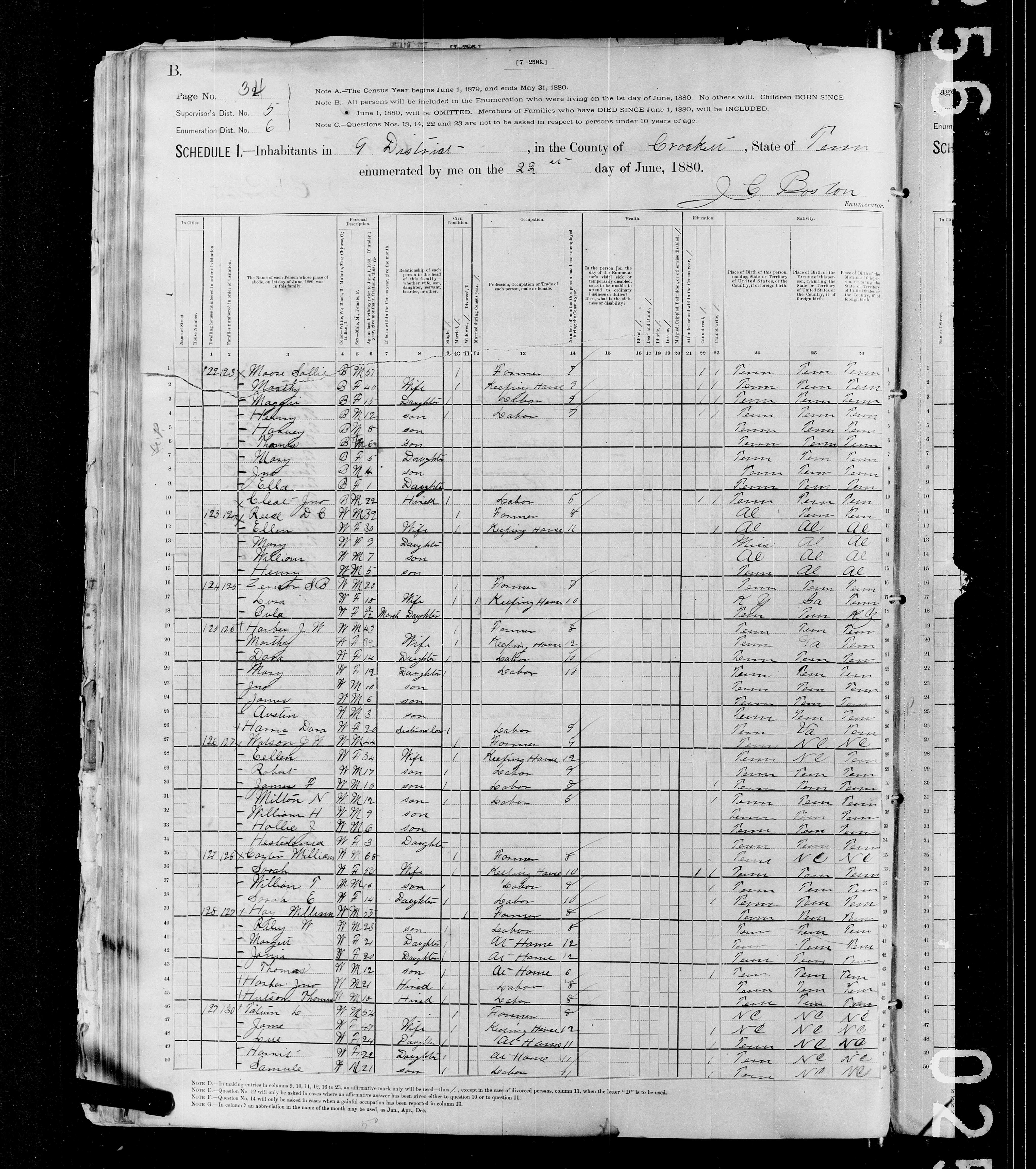 3203. “United States Census,” 1880, TN, Crockett, Crockett Mills, District 9, 34B, 5, 6, T9, 1255249, 231, 261, 10th Decennial Census Office, Bureau of the Census, US Dept. of Commerce, United States of America, June 22, 1880, J C Boston.
