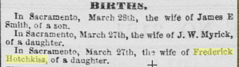 3509. “Births,” Baby girl Hotchkiss, Sacramento Daily Union, Sacramento, CA, September 6, 1864, 2, Lists a daughter born on September 2, 1864 in Sacramento.