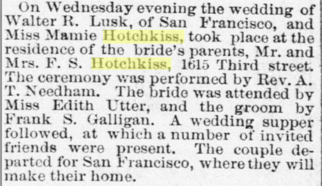 On Wednesday evening the wedding of Walter R. Lusk, of San Francisco, and Miss Mamie Hotchkiss, took place at the residence of the bride's parents, Mr. and Mrs. F. S. Hotchkiss, 1615 Third street. The ceremony was performed by Rev. A. T. Needham. The bride was attended by Miss Edith Utter, and the groom by Frank S. Galligan. A wedding supper followed, at which a number of invited friends were present. The couple departed for San Francisco, where they will make their home.