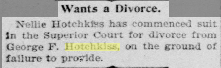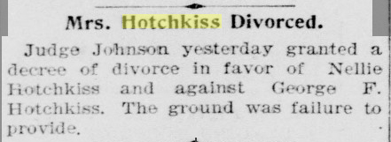 Judge Johnson yesterday granted a decree of divorce in favor of Nellie Hotchkiss and against George F. Hotchkiss. The ground was failure to provide.