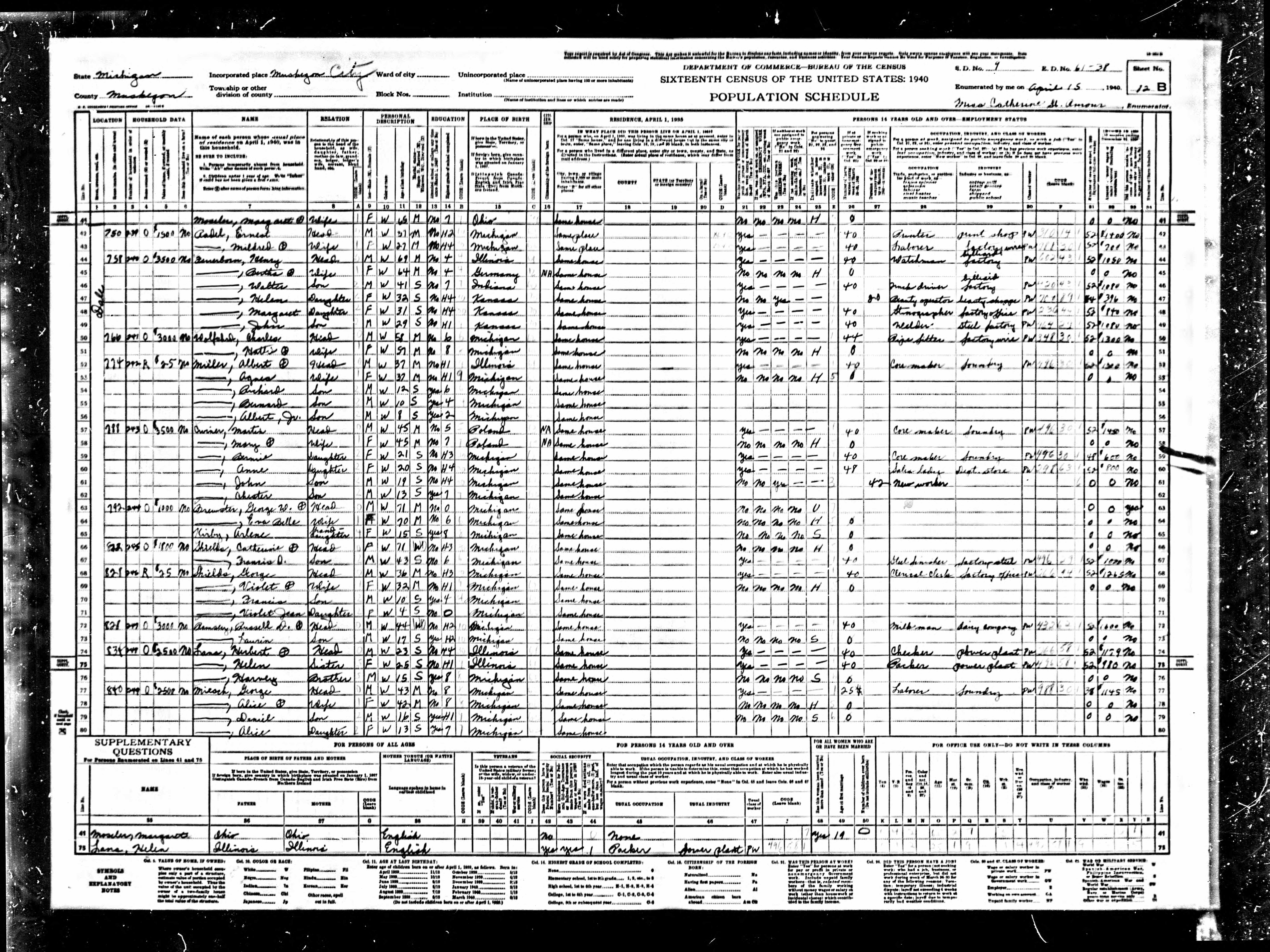 3620. “United States Census: 1940,” Bureau of the Census, US Dept. of Commerce, United States of America, 1940, MI, Muskegon, Muskegon, April 15, 1940, Miss Cathering St. Amour, 12B, 9, 61-38, T627, 1795.