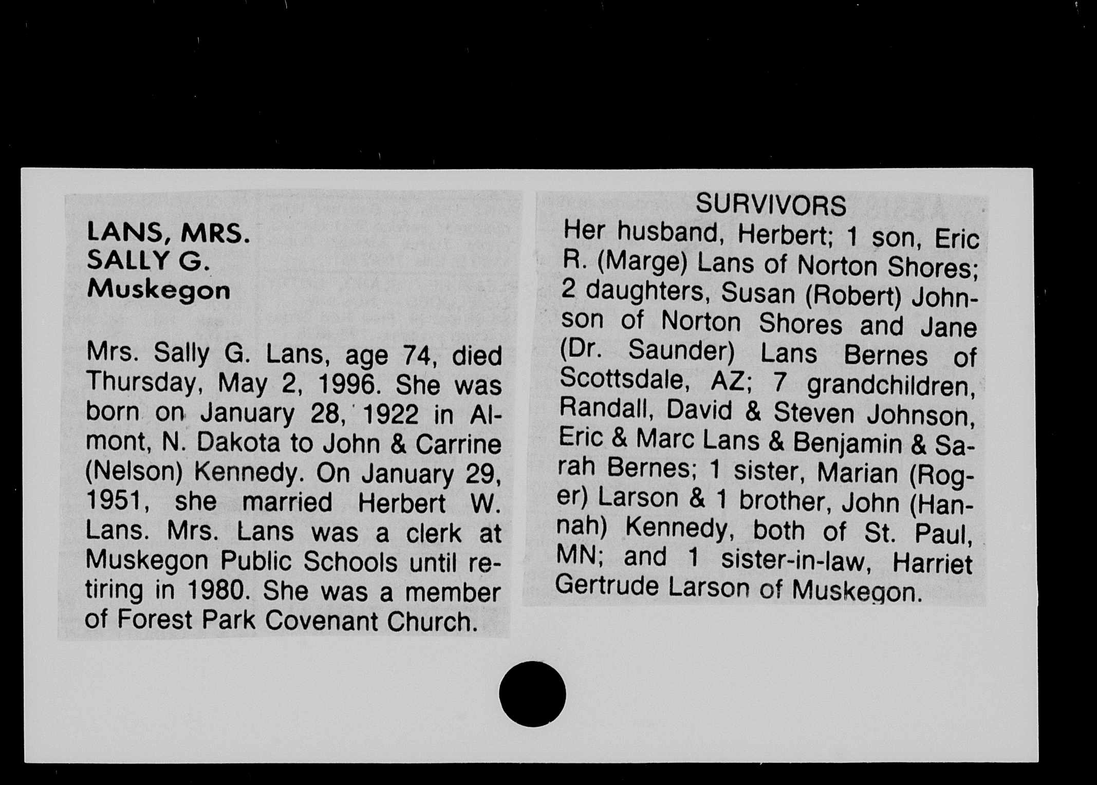 Mrs. Sally G. Lans, age 74, died Thursday, May 2, 1996. She was born on January 28, 1922 in Almont, N. Dakota to John & Carrine (Nelson) Kennedy. On January 29, 1951, she married Herbert W. Lans. Mrs. Lans was a clerk at Muskegon Public Schools until retiring in 1980. She was a member of Forest Park Covenant Church.