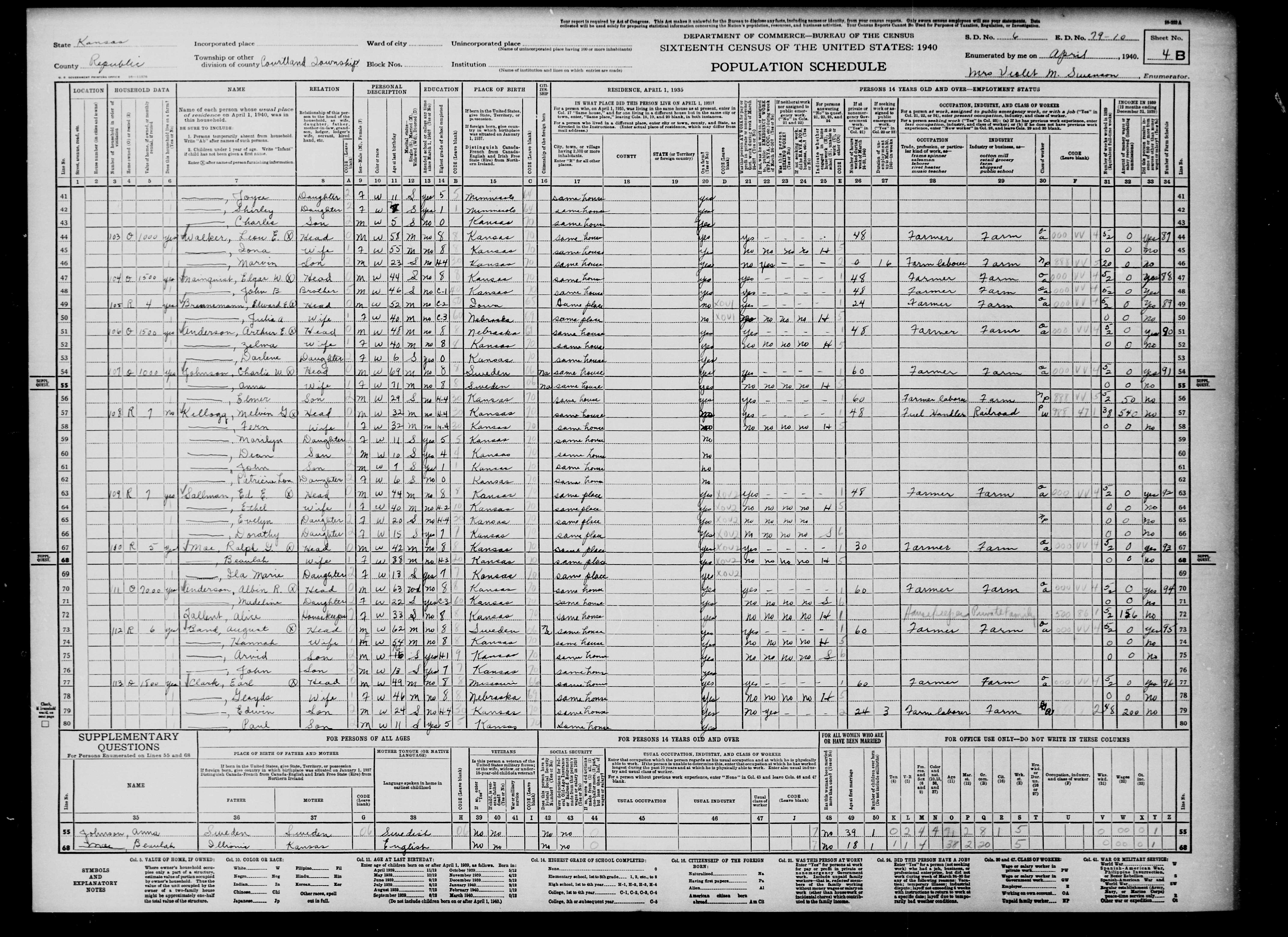 3656. “United States Census: 1940,” Bureau of the Census, US Dept. of Commerce, United States of America, 1940, KS, Republic, Courtland, April, 1940, Violet M Swenson, 4B, 6, 79-10, T627, 1255, 175.