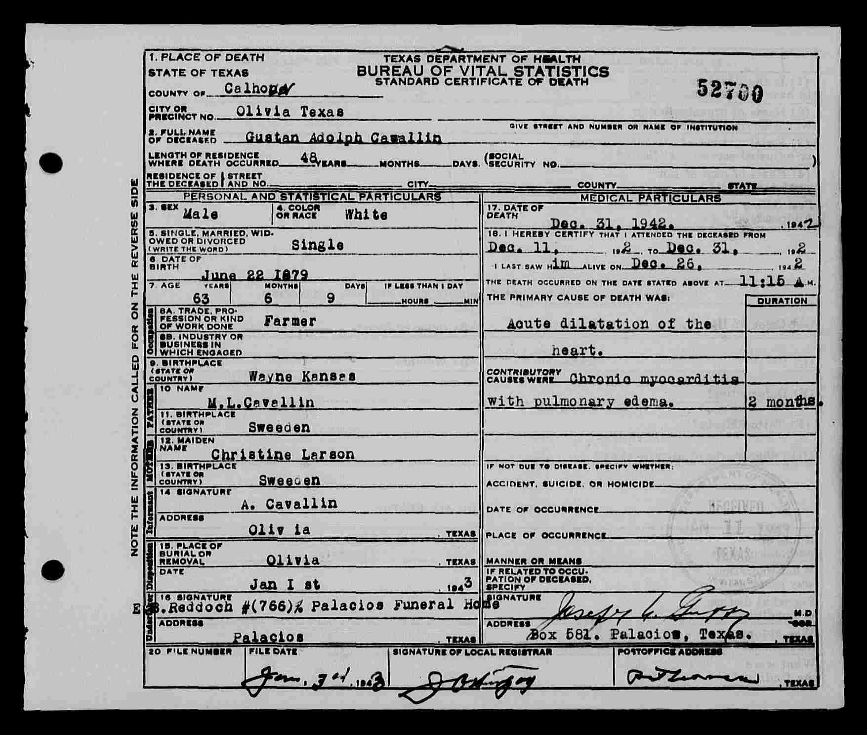 3686. “Texas Deaths 1890-1976,” Gustav Adolph Cavallin, microfilm, film number: 2137186-digital film number: 4136001-image number: 1468-reference number: 52700, https://familysearch.org/pal:/MM9.1.2/MM5V-B7F/p2.