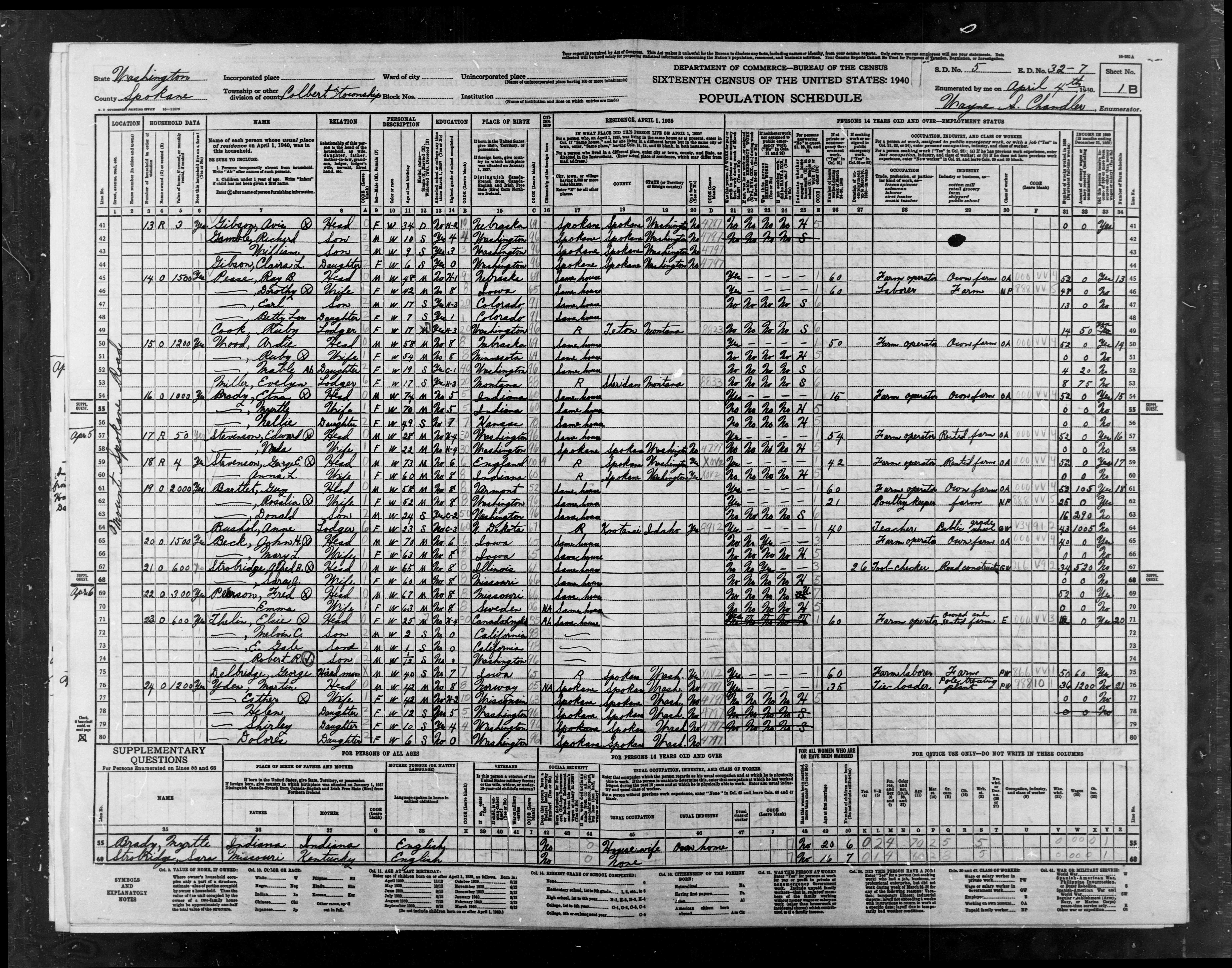 3687. “United States Census,” 1940, WA, Spokane, Colbert, 1B, 5, 32-7, T627, 04362, 107, Bureau of the Census, US Dept. of Commerce, United States of America, April 6, 1940, Wayne S Chandler.