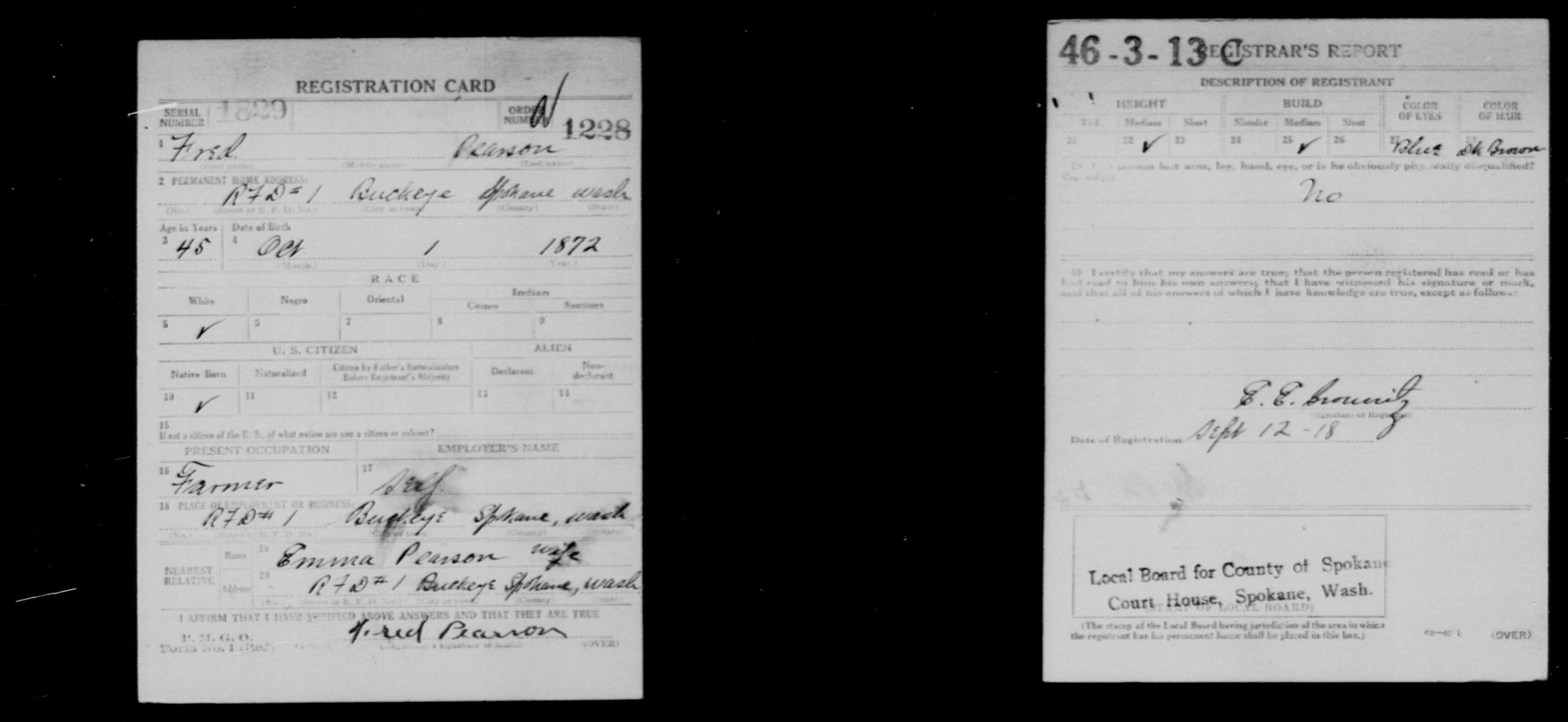 3688. Pearson, Fred, World War I, 1918, WA, 1829, “World War I Draft Cards,” September 12, 1918, Spokane, Spokane County, WA, https://familysearch.org/ark:/61903/1:1:29JZ-537.