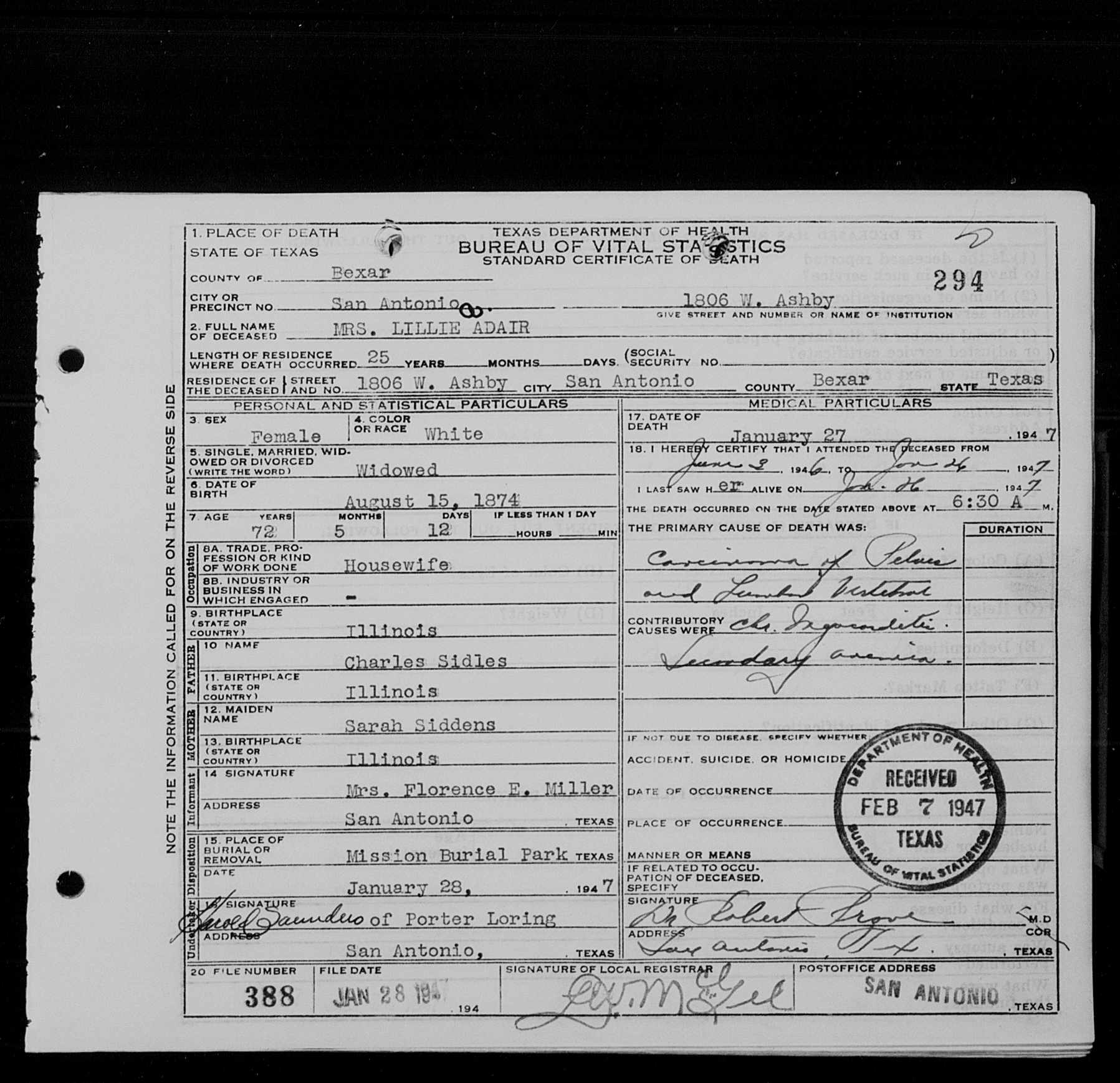 3698. Lillie Adair, “Texas Deaths, 1890-1976,” January 27, 1947, San Antonio, Bexar County, TX, https://familysearch.org/ark:/61903/1:1:K39X-TLQ.