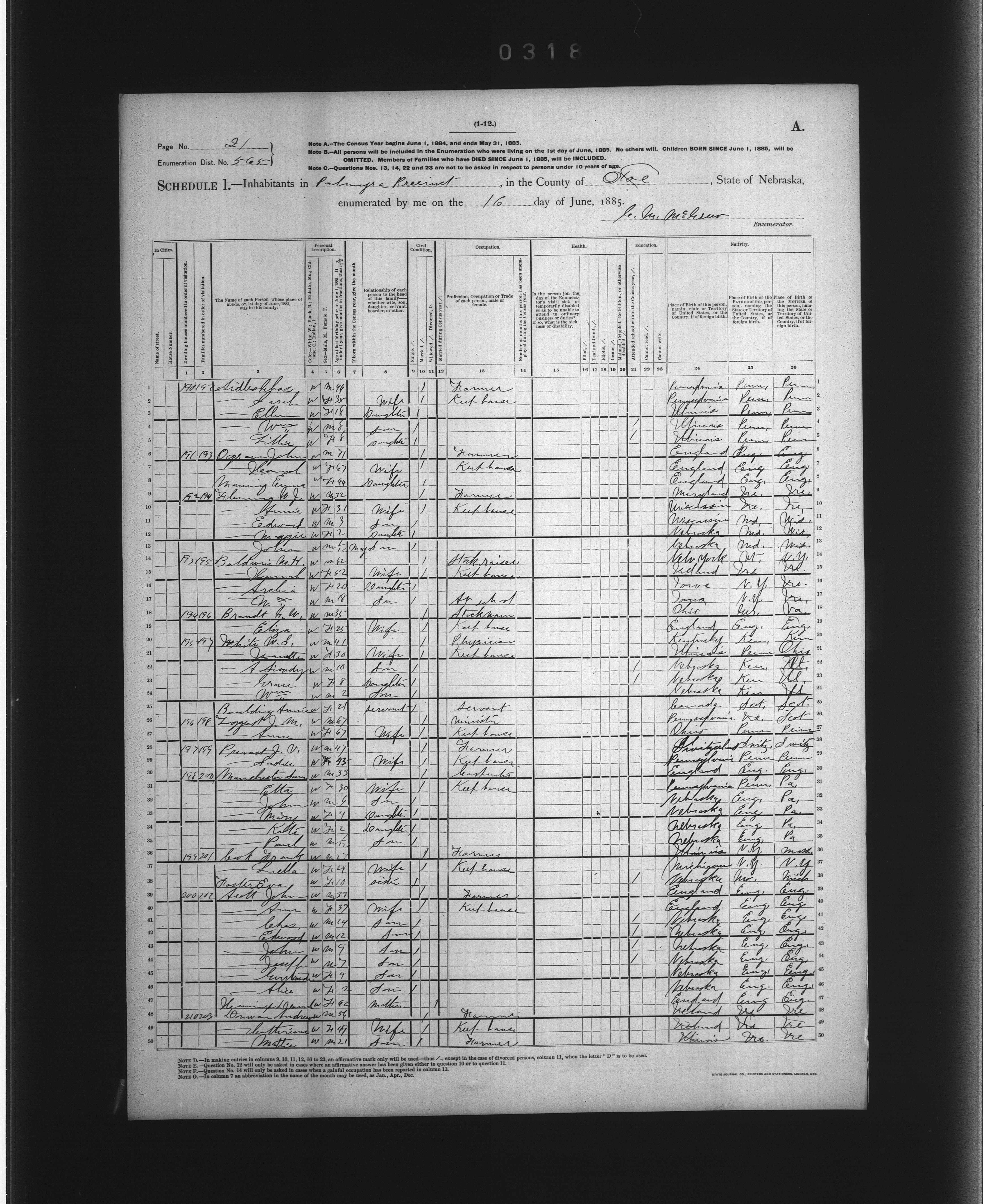 3700. “Nebraska State Census,” 1885, NE, Otoe, Palmyra, 21, 565, M352, 499,568, 327, June 16, 1885, C M McGrew.