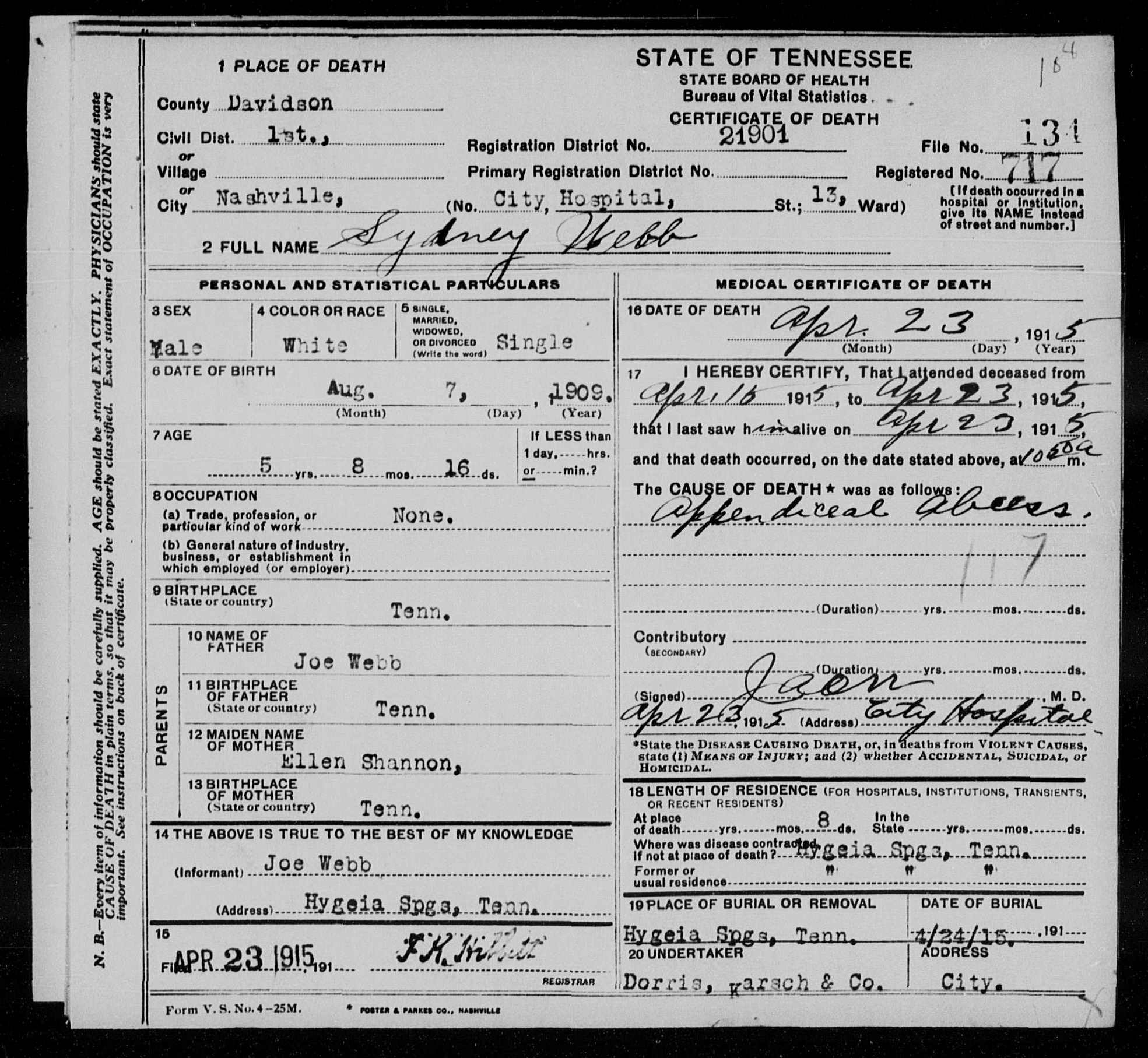 3821. Sydney Webb, “Tennessee Death Records, 1914-1955,” microfilm, digital folder number: 4183030-image number: 2179-film number: 1299634-volume/page/certificate number: v 9 cn 134, https://familysearch.org/pal:/MM9.1.2/M17T-M7Y/p1.