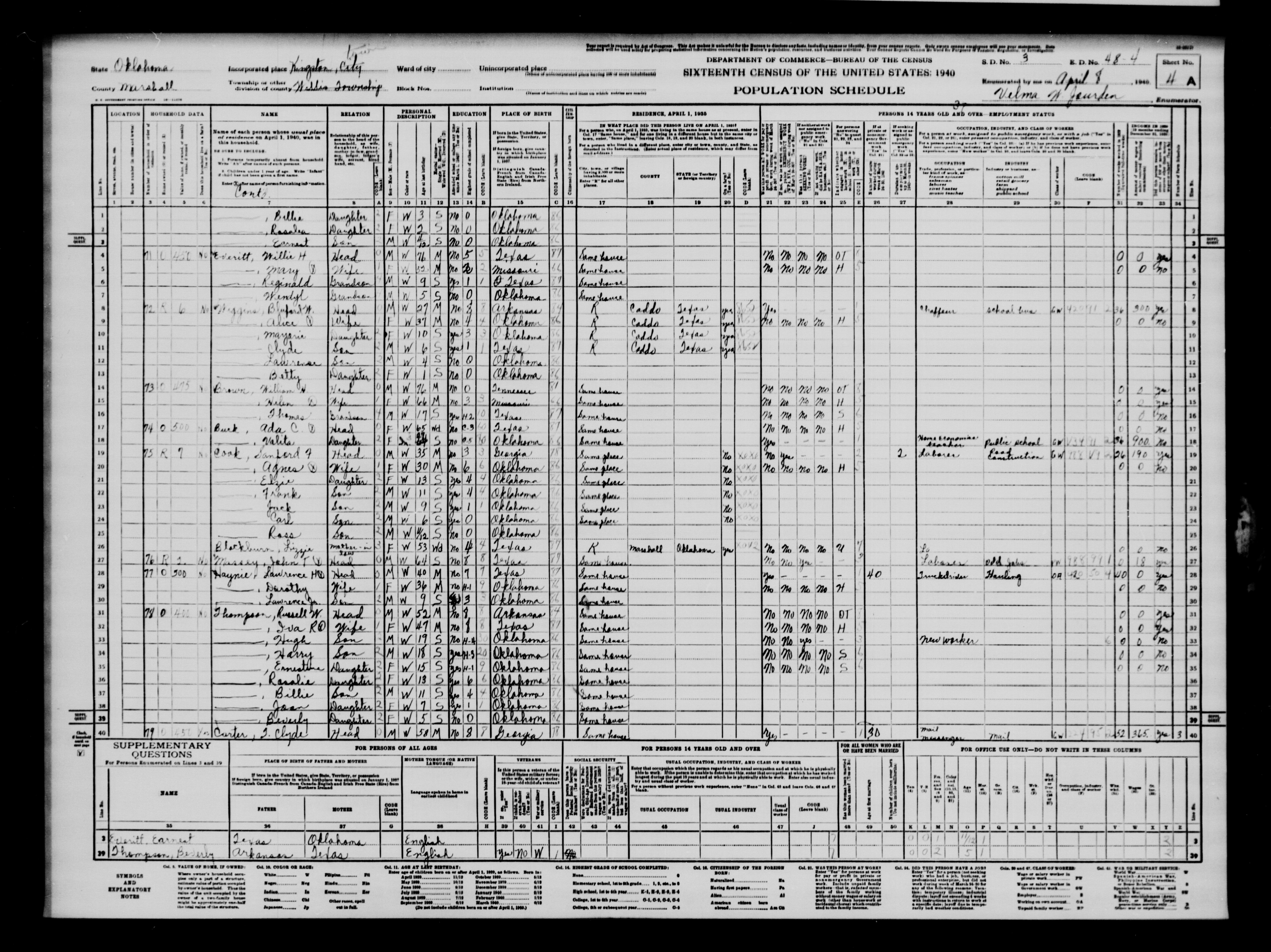 3838. “United States Census,” 1940, OK, Marshall, Kingston, Wellis Township, 4A, 3, 48-4, T627, 3311, 79, Bureau of the Census, US Dept. of Commerce, United States of America, April 8, 1940, Velma W Jourden.