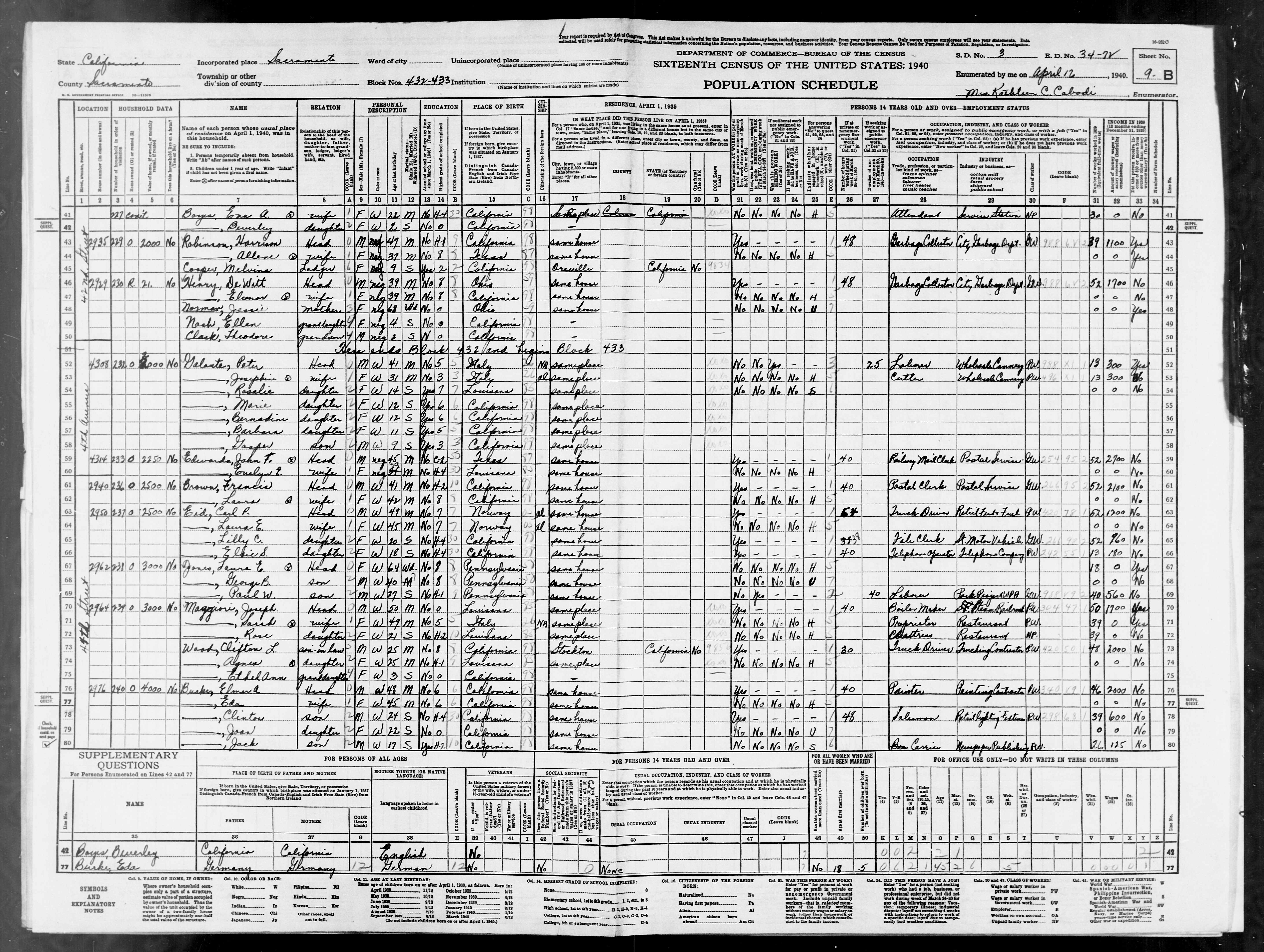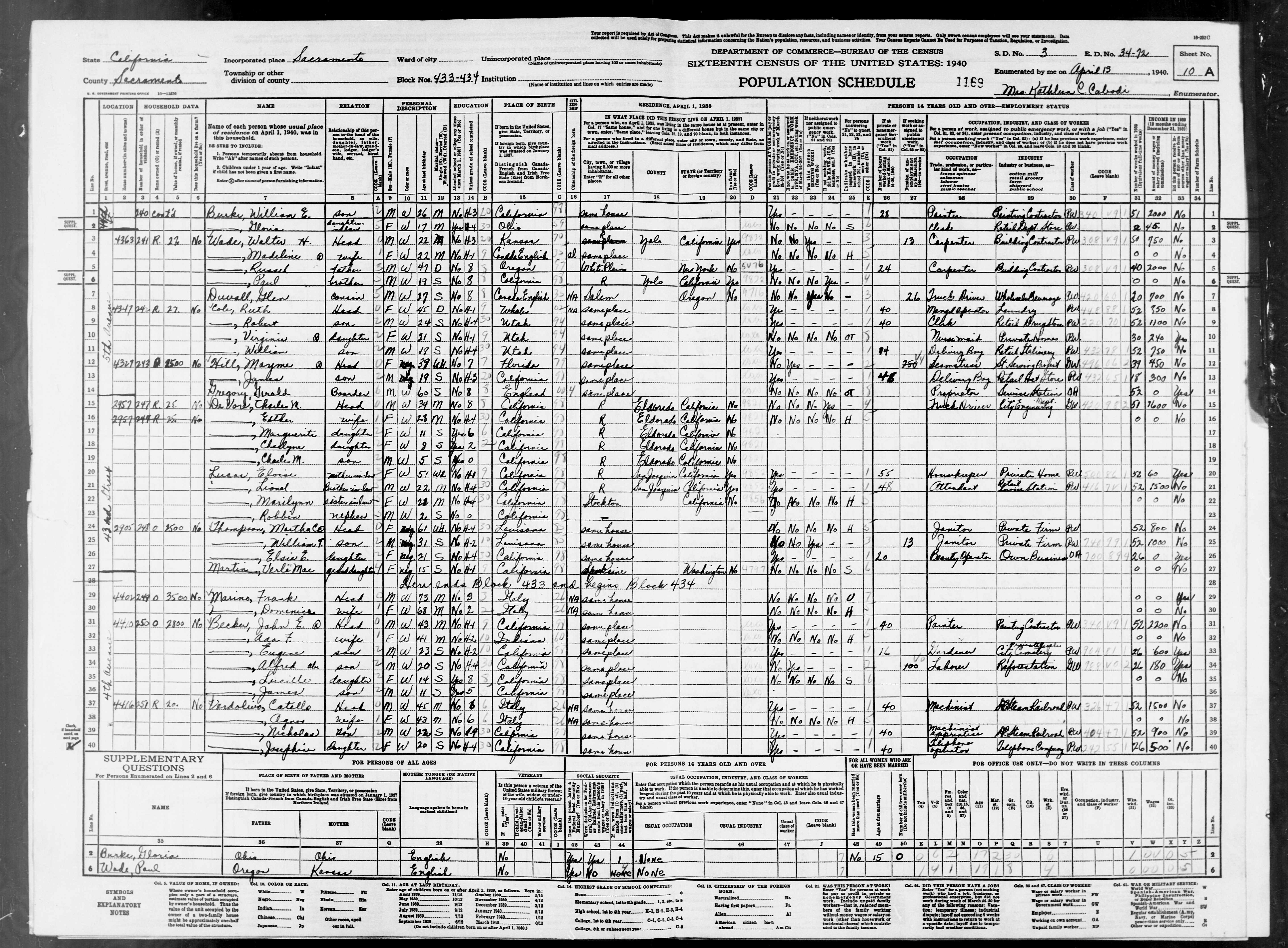 3842. “United States Census: 1940,” Bureau of the Census, US Dept. of Commerce, United States of America, 1940, CA, Sacramento, Sacramento, April 12, 1940, Mrs. Kathleen C Cabodi, 9B-10A, 3, 34-72, T627, 283, 162.