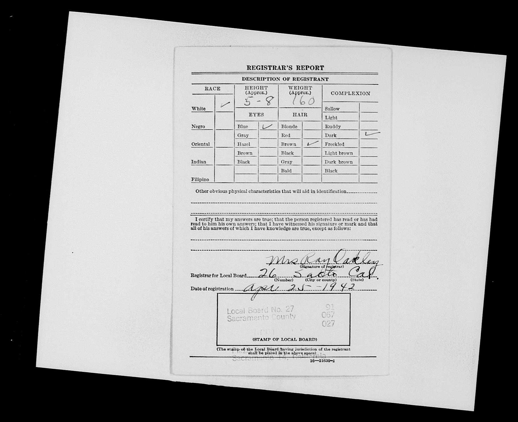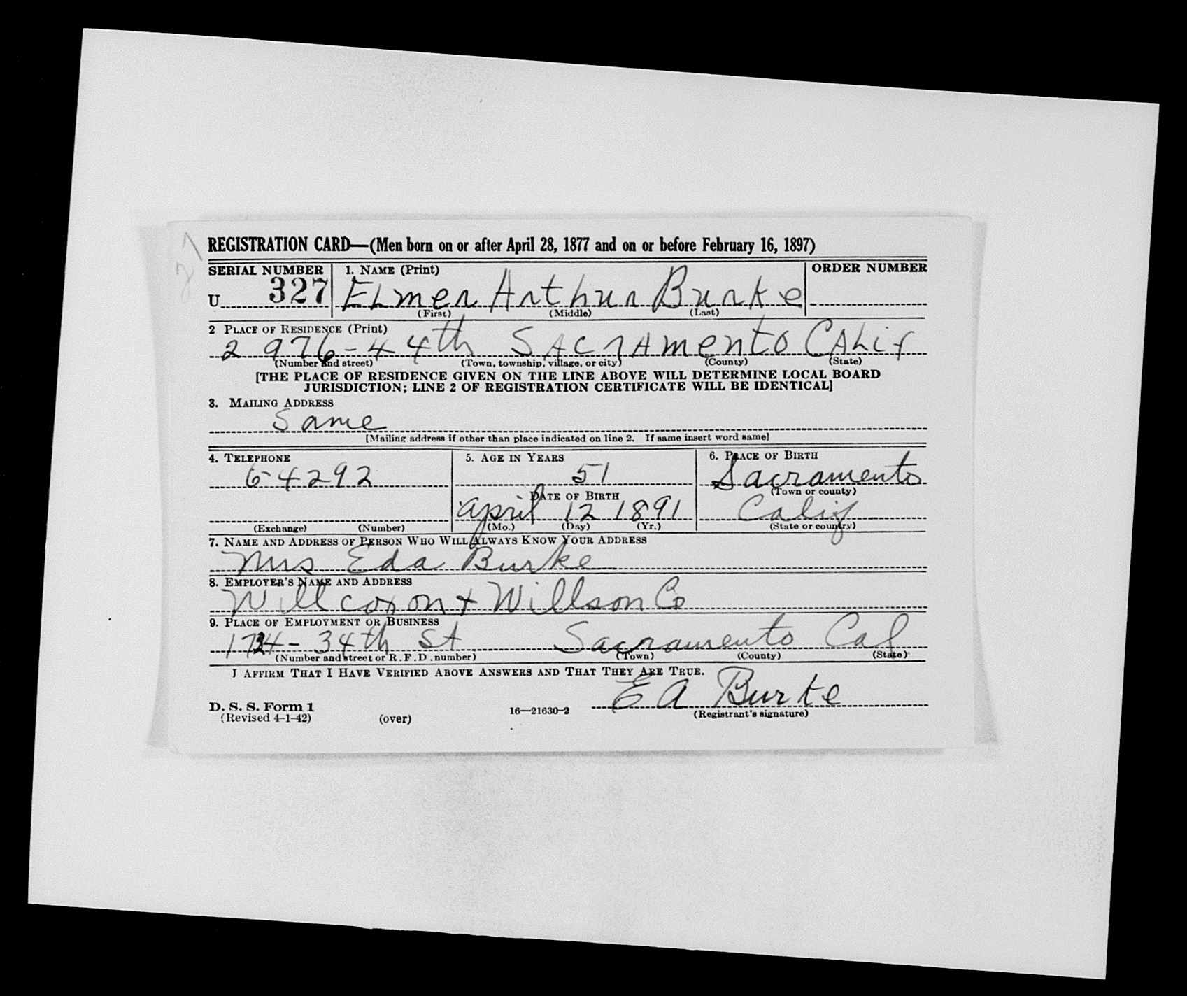 3843. World War II, 1942, California, U327, Burke, Elmer Arthur, “World War II Draft Registration Cards,” April 25, 1942, Sacramento, CA, https://familysearch.org/pal:/MM9.3.1/TH-1-16305-112813-98?cc=1861144.