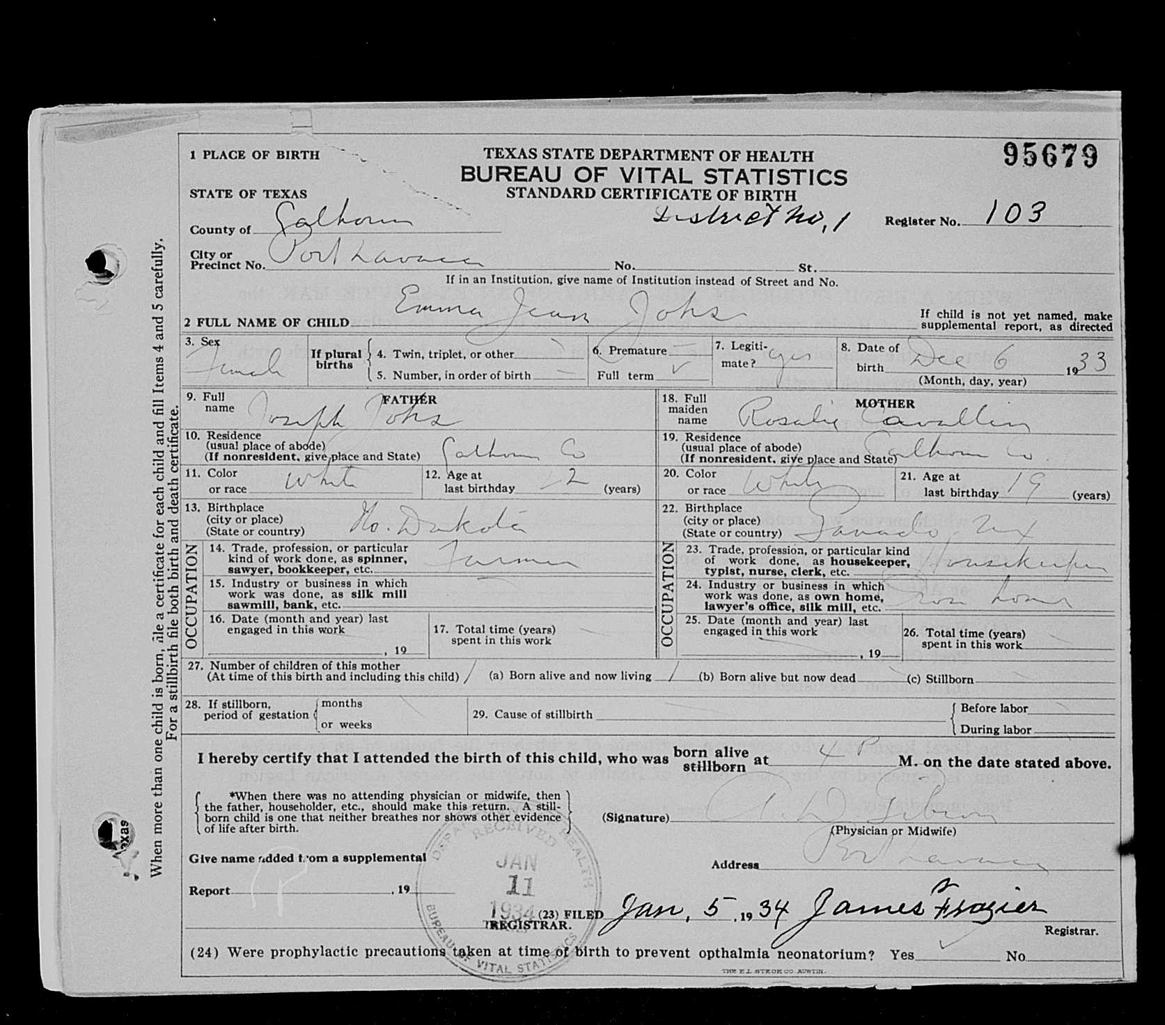 3980. Emma Jean Johs, “Texas Birth Certificates, 1903-1935,” December 6, 1933, Port Lavaca, Calhoun County, TX, https://www.familysearch.org/ark:/61903/1:1:K6LL-NWR.
