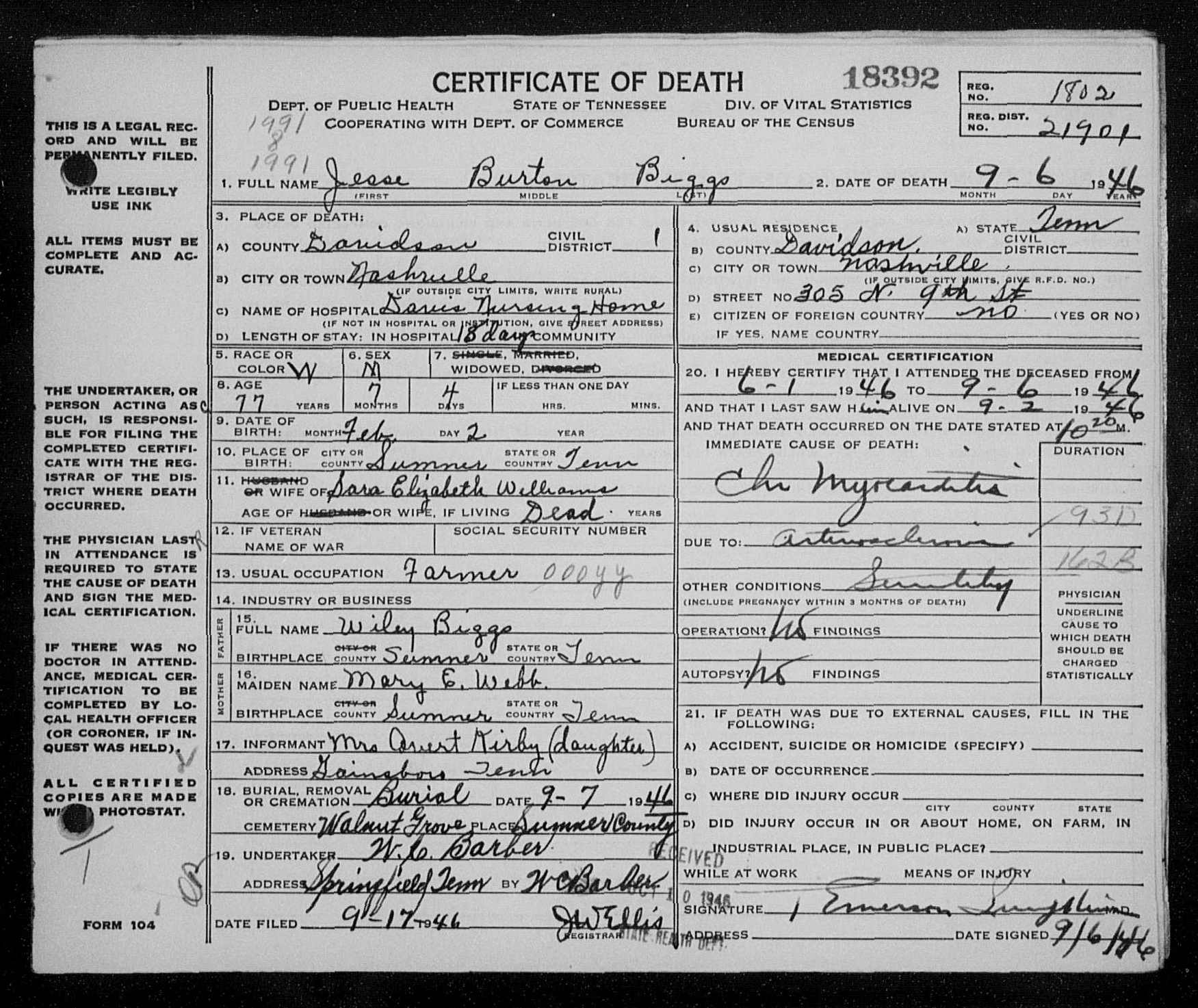 4137. Jesse Burton Biggs, “Tennessee Death Records, 1914-1955,” microfilm, digital folder number: 4184914-image number: 1026-film number: 2137374-volume/page/certificate number: cn 18392, https://familysearch.org/pal:/MM9.1.2/M144-RS8/p2.