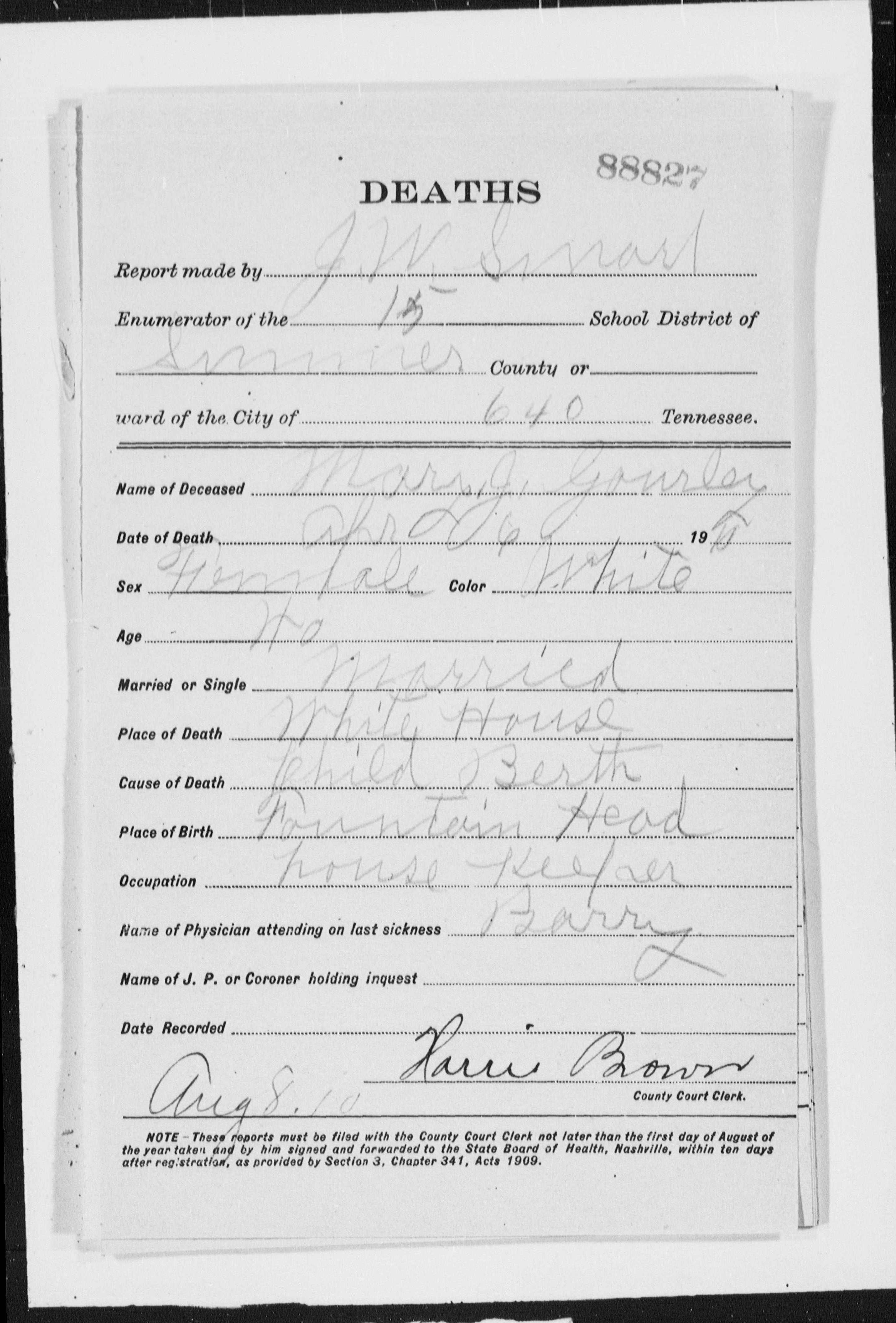 4138. Mary J Gourley, “Tennessee Deaths and Burials, 1874-1955,” April 6, 1910, White House, Sumner County, TN, https://www.familysearch.org/ark:/61903/1:1:F6R2-361.