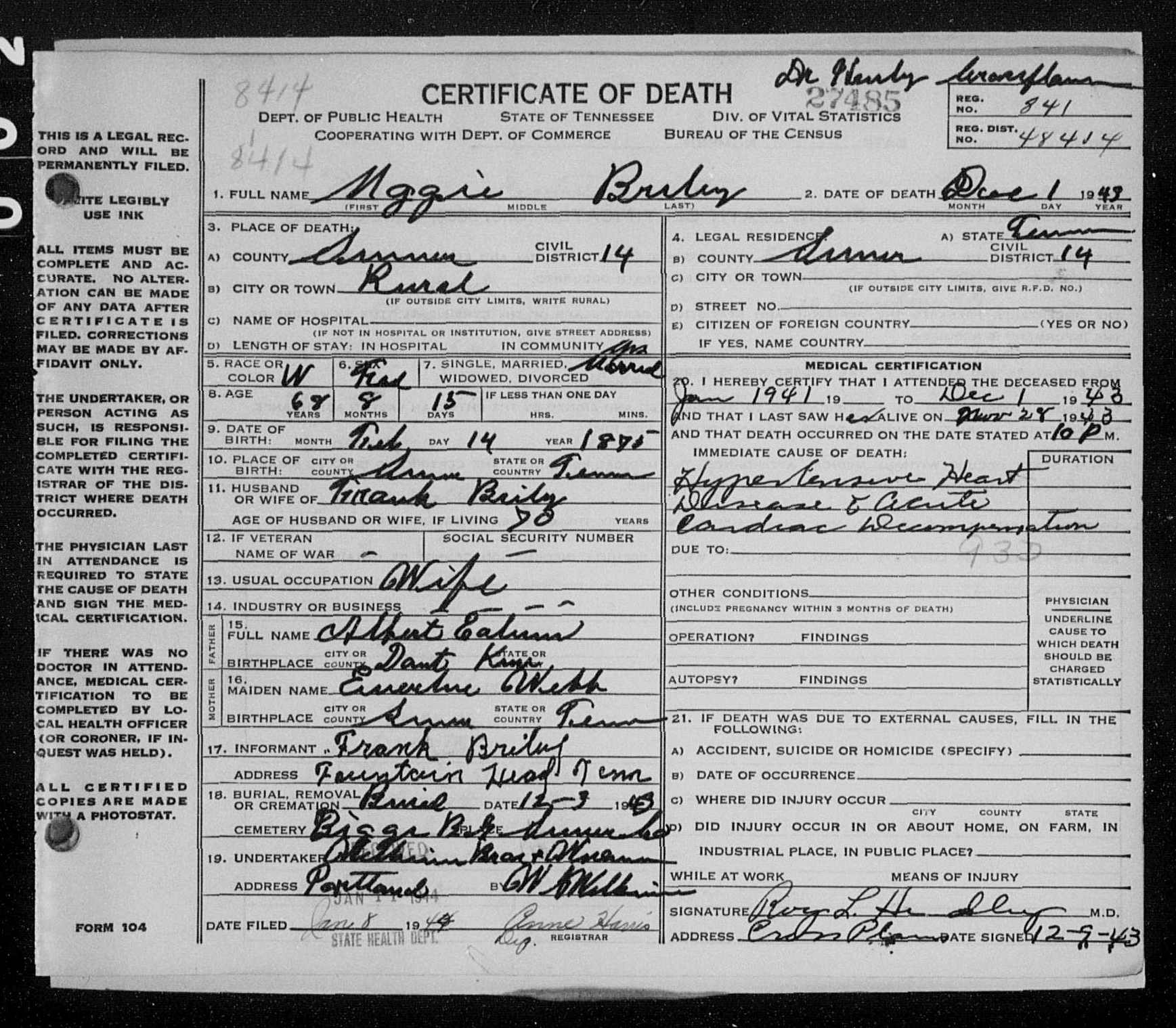 4143. Maggie Briley, “Tennessee, Death Records, 1914-1955,” December 1, 1943, microfilm, Digital Folder Number: 004184883-Image Number: 02753-GS Film number: 2137341-Reference ID: cn 27485, https://familysearch.org/pal:/MM9.1.1/NSR7-9RQ.