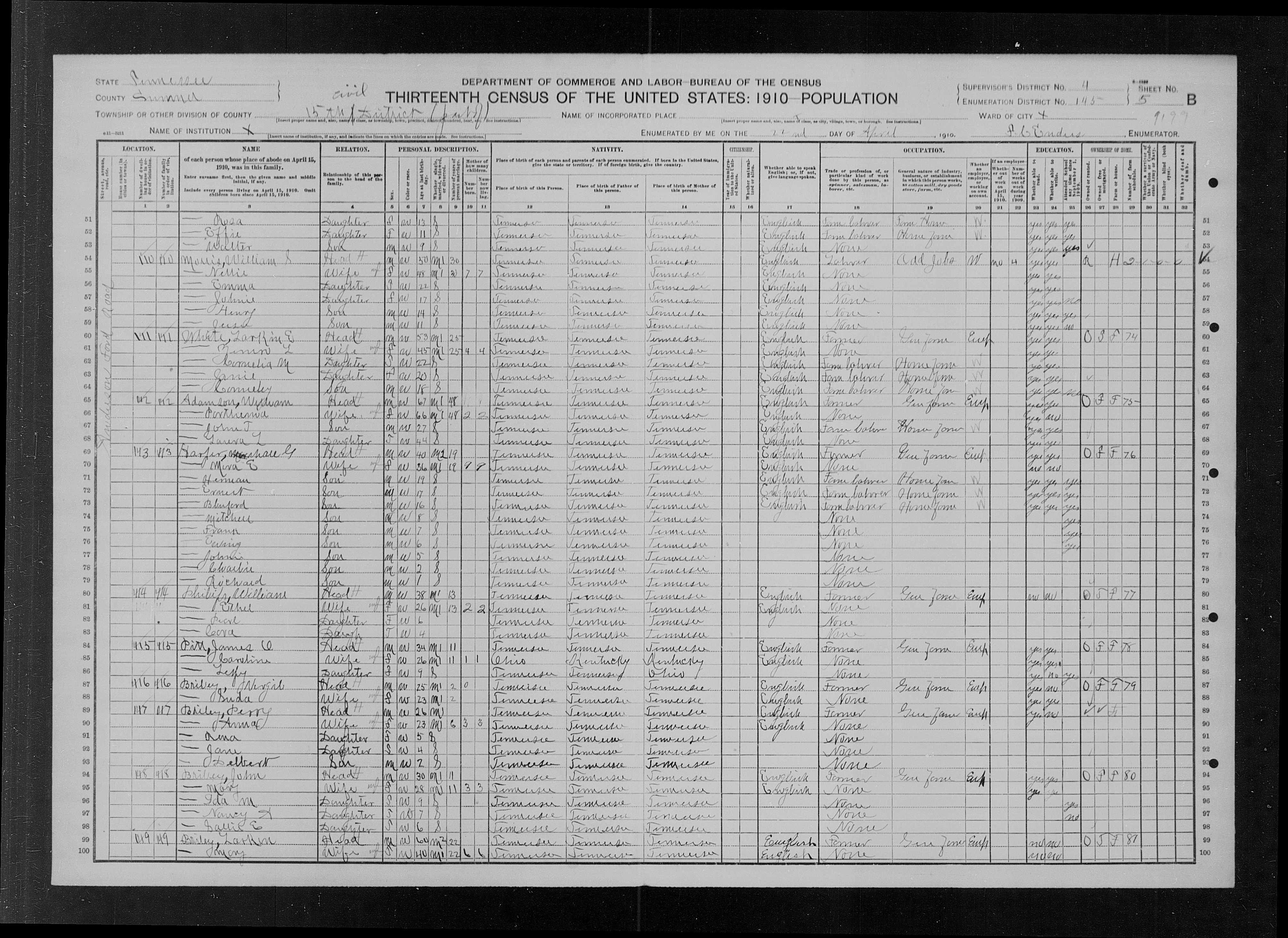 4152. “United States Census,” 1910, TN, Sumner, District 15, 5B, 4, 145, T624, 91, Bureau of the Census, US Dept. of Commerce, United States of America, April 22, 1910, F G Enders.