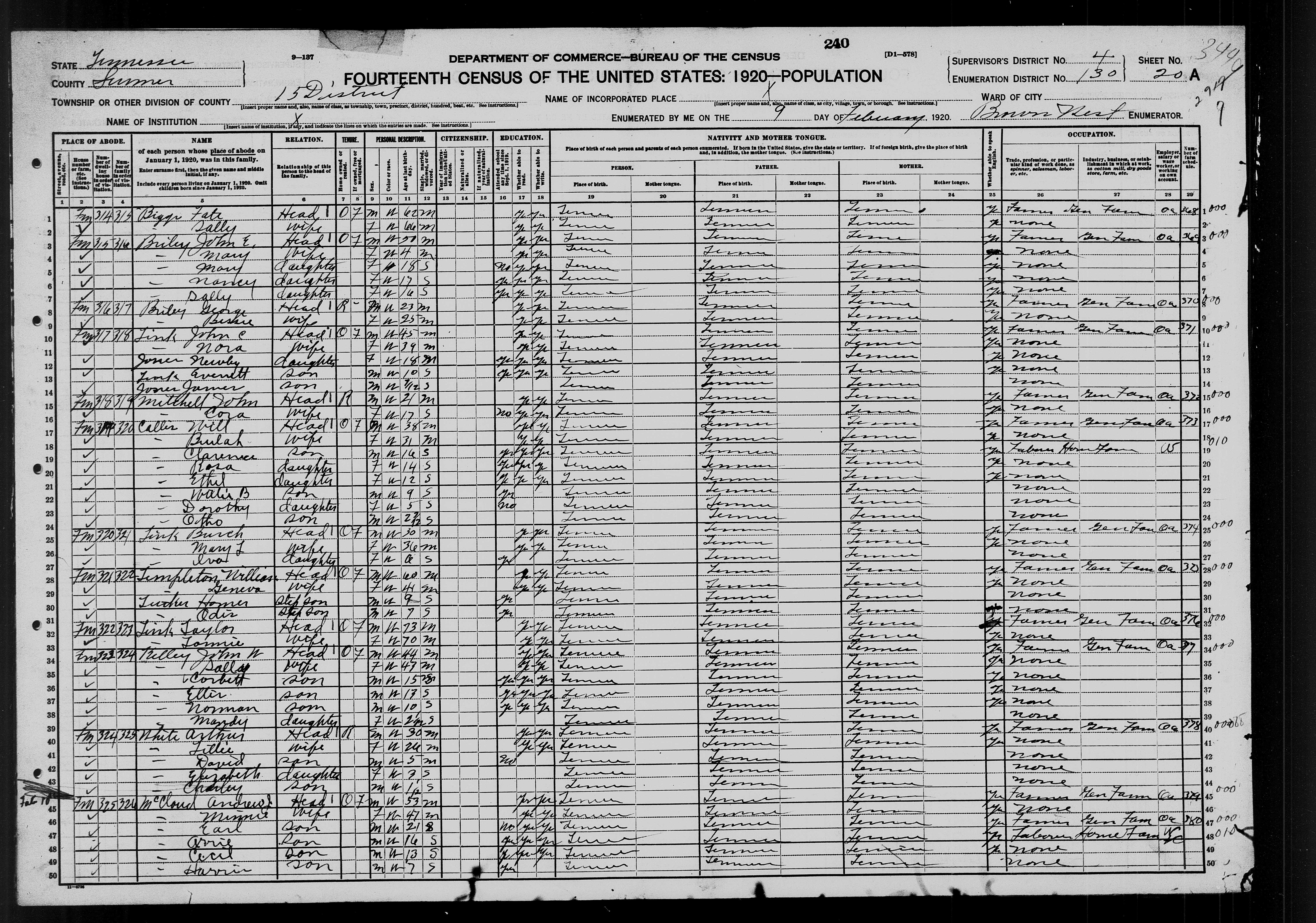 4153. “United States Census,” 1920, TN, Sumner, District 15, 20A, 4, 130, T625, 1059, Bureau of the Census, US Dept. of Commerce, United States of America, February 9, 1920, Brown Rest.