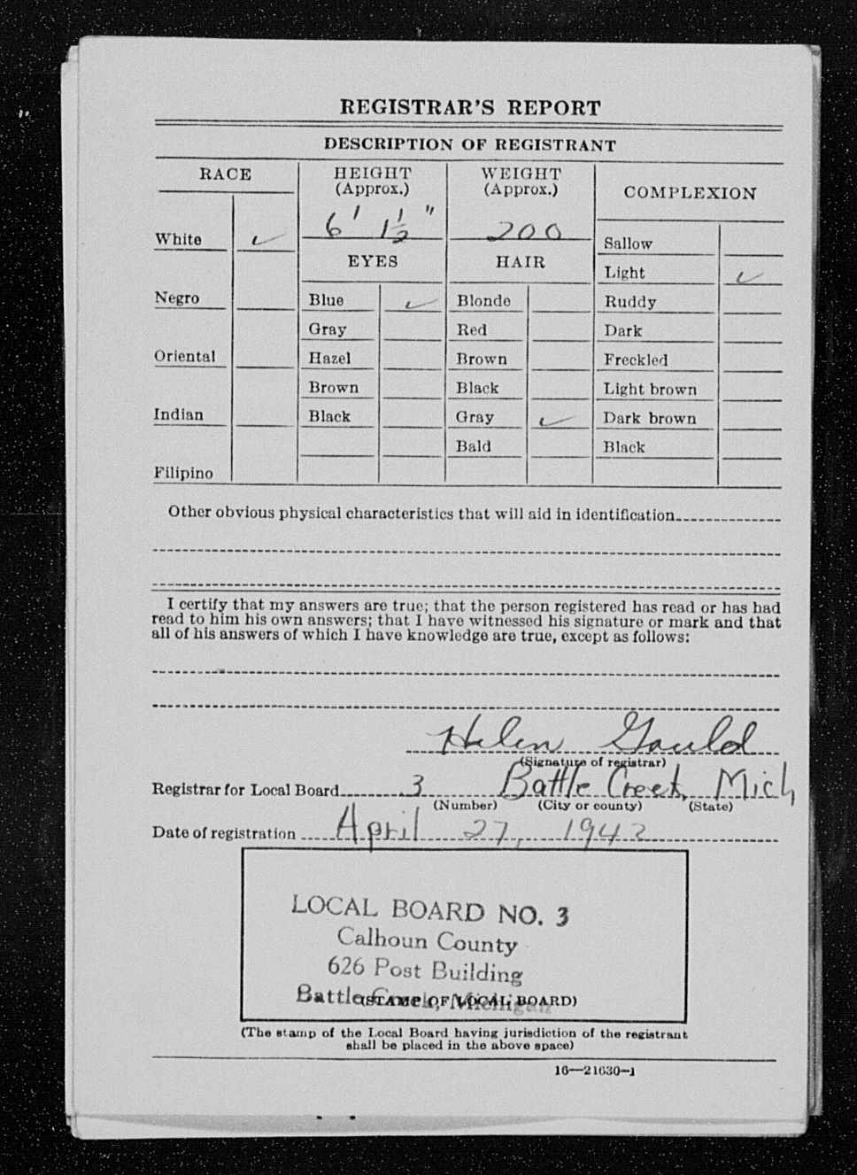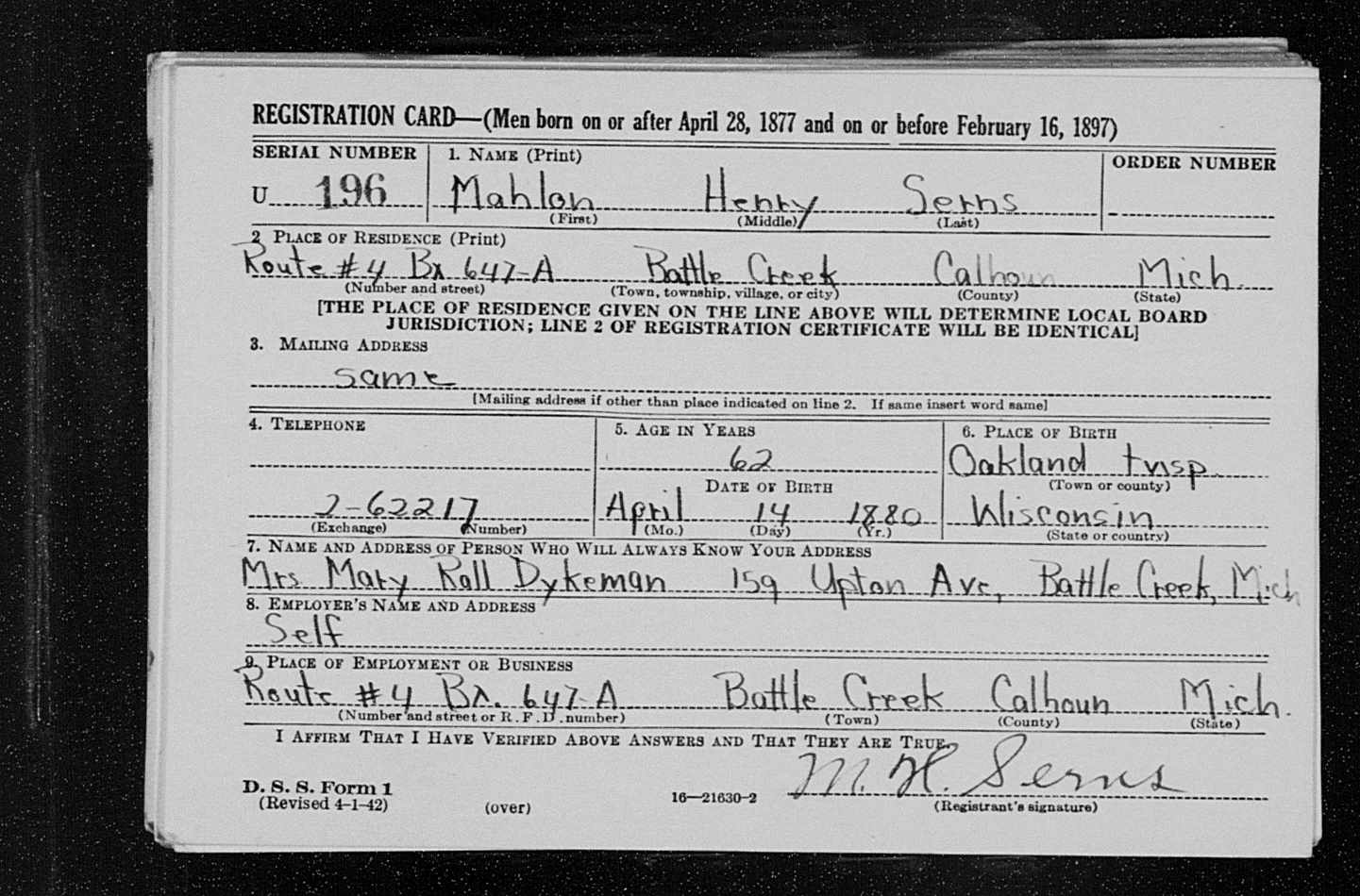 4166. World War II, 1942, California, U196, Serns, Mahlon Henry, “World War II Draft Cards (4th Registration) for the State of Michigan,” April 27, 1942, Battle Creek, Calhoun County, MI, https://familysearch.org/pal:/MM9.1.1/J4SN-B2X.