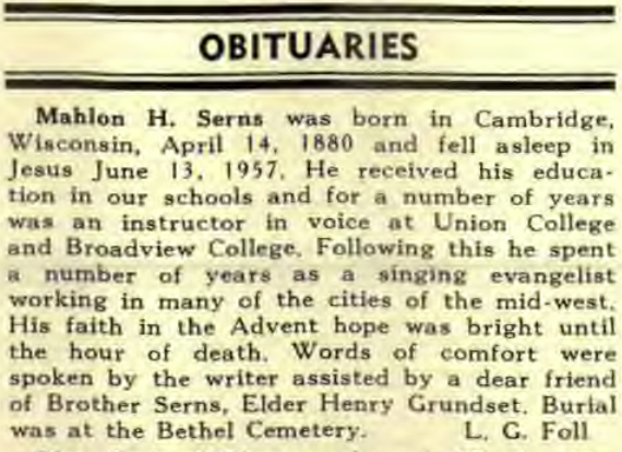 Mahlon H. Serns was born in Cambridge, Wisconsin, on April 14, 1880 and fell asleep in Jesus June 13, 1957. He received his education in our schools and for a number of years was an instructor in voice at Union College and Broadview College. Following this he spent a number of years as a singing evangelist working in many of the cities of the mid-west. His faith in the Advent hope was bright until the hour of death. Words of comfort were spoken by the writer assisted by a dear friend of Brother Serns, Elder Henry Grundset. Burial was at the Bethel Cemetery.