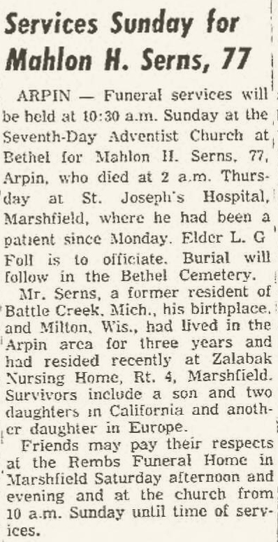 Arpin--Funeral services will be held at 10:30 a.m. Sunday at the Seventh-Day Adventist Church at Bethel for Mahlon H. Serns, 77, Arpin, who died at 2 a.m. Thursday at St. Joseph’s Hospital, Marshfield, where he had been a patient since Monday. Elder L. G. Foll is to officiate. Burial will follow in the Bethel Cemetery.