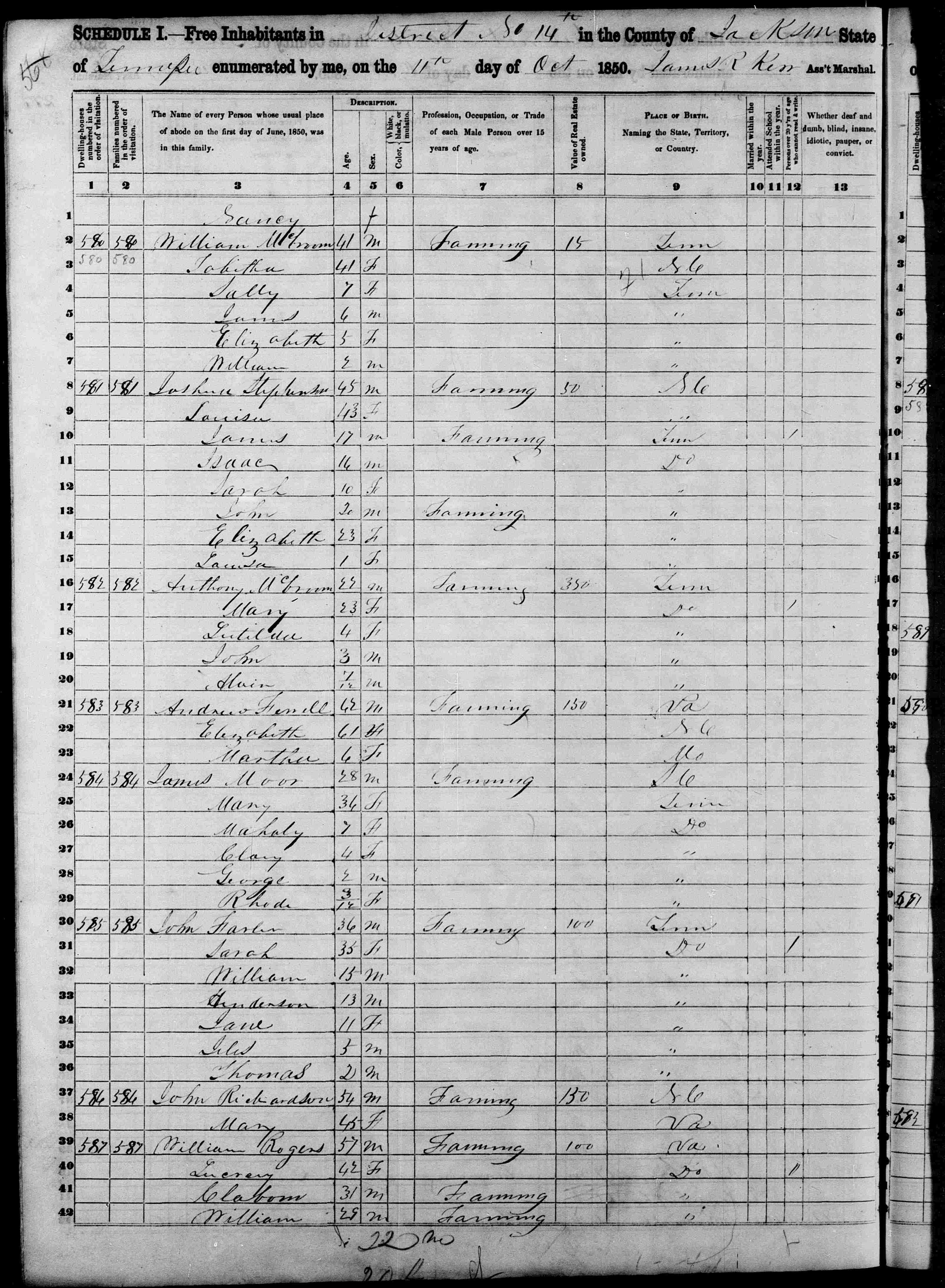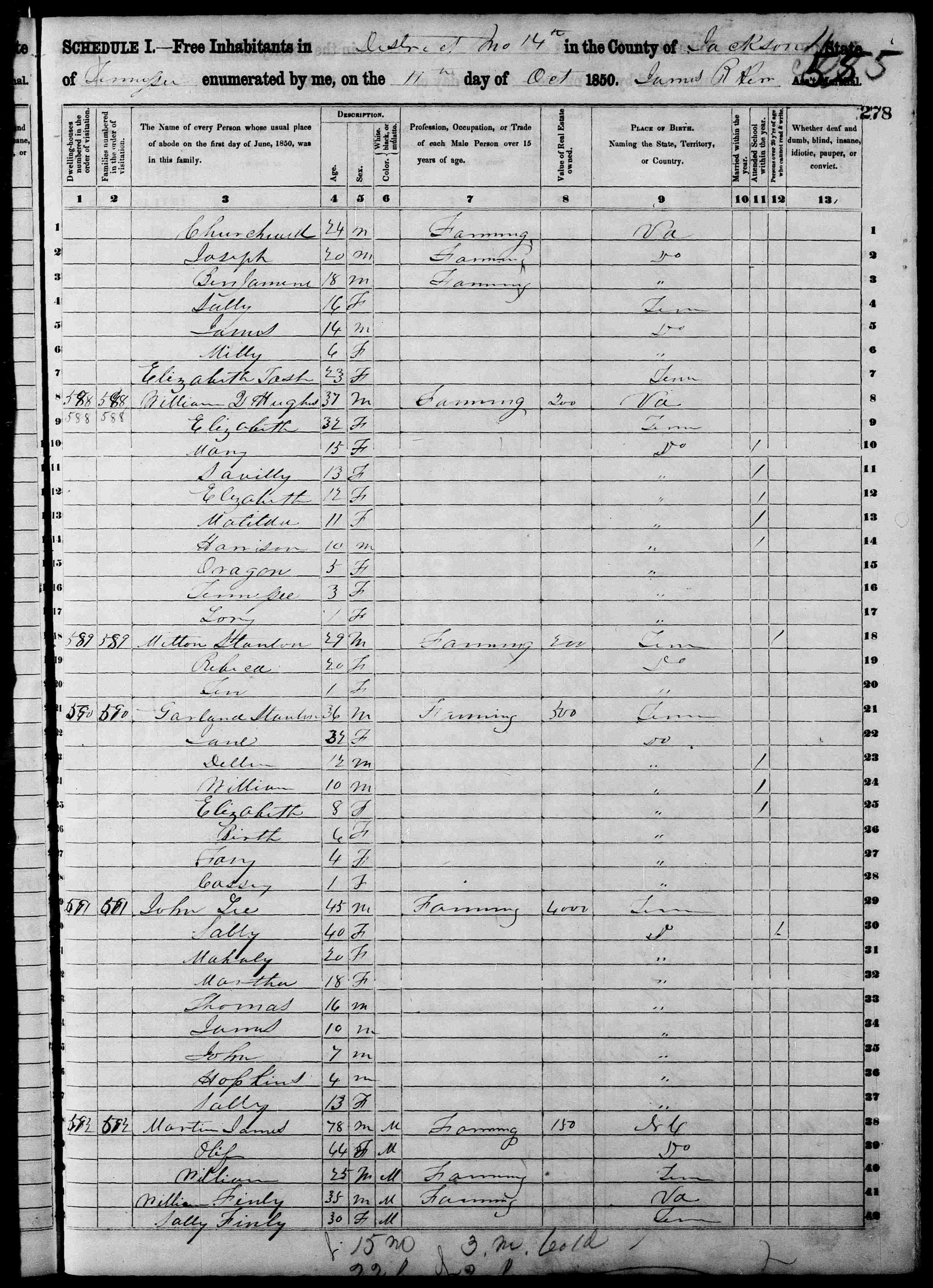Files (2): 1850 TN Jackson County Dist 14 p277, 1850 TN Jackson County Dist 14 p278