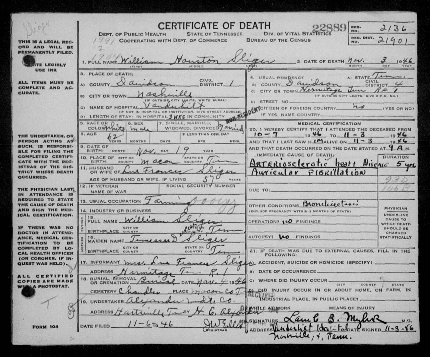 4179. William Houston Sliger, “Tennessee Death Records, 1914-1955,” microfilm, digital folder number: 4184916-image number: 447-film number: 2137376-volume/page/certificate number: cn 22889, https://familysearch.org/pal:/MM9.1.2/M14H-9F8/p3.