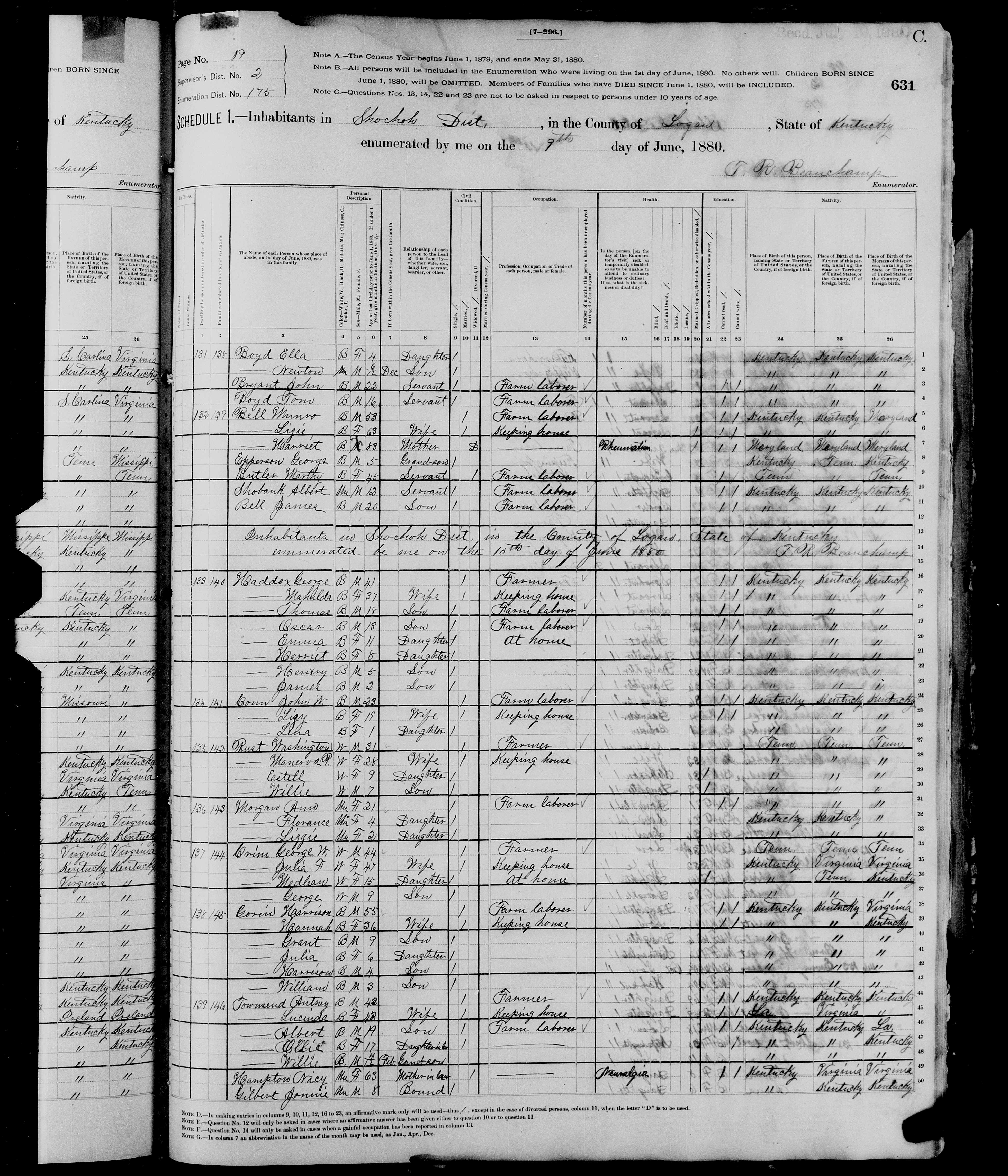 4204. “United States Census,” 1880, KY, Logan, Schochoh, 19C, 2, 175, T9, 1254429, 321, 707, Bureau of the Census, US Dept. of Commerce, United States of America, June 9, 1880, T R Beauchamp.