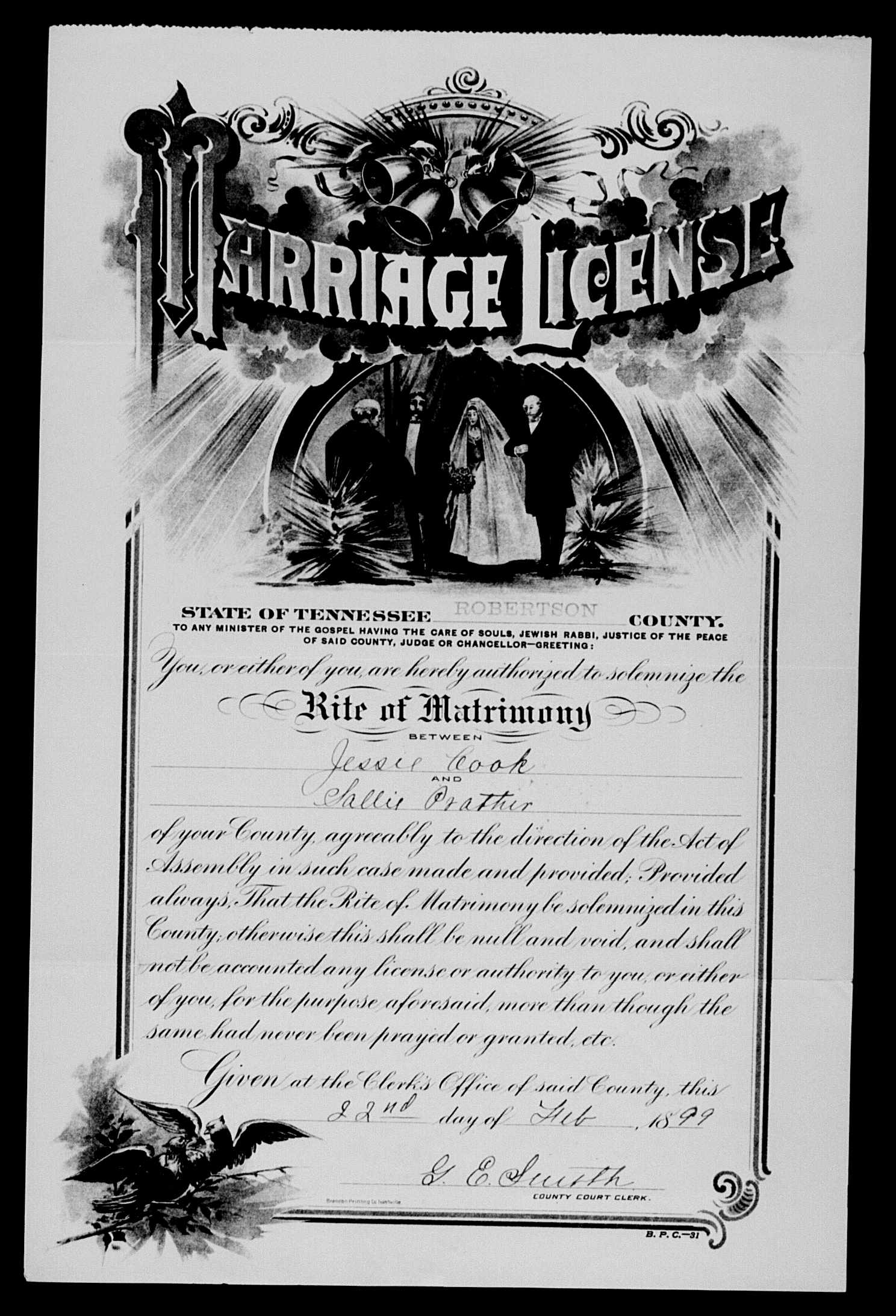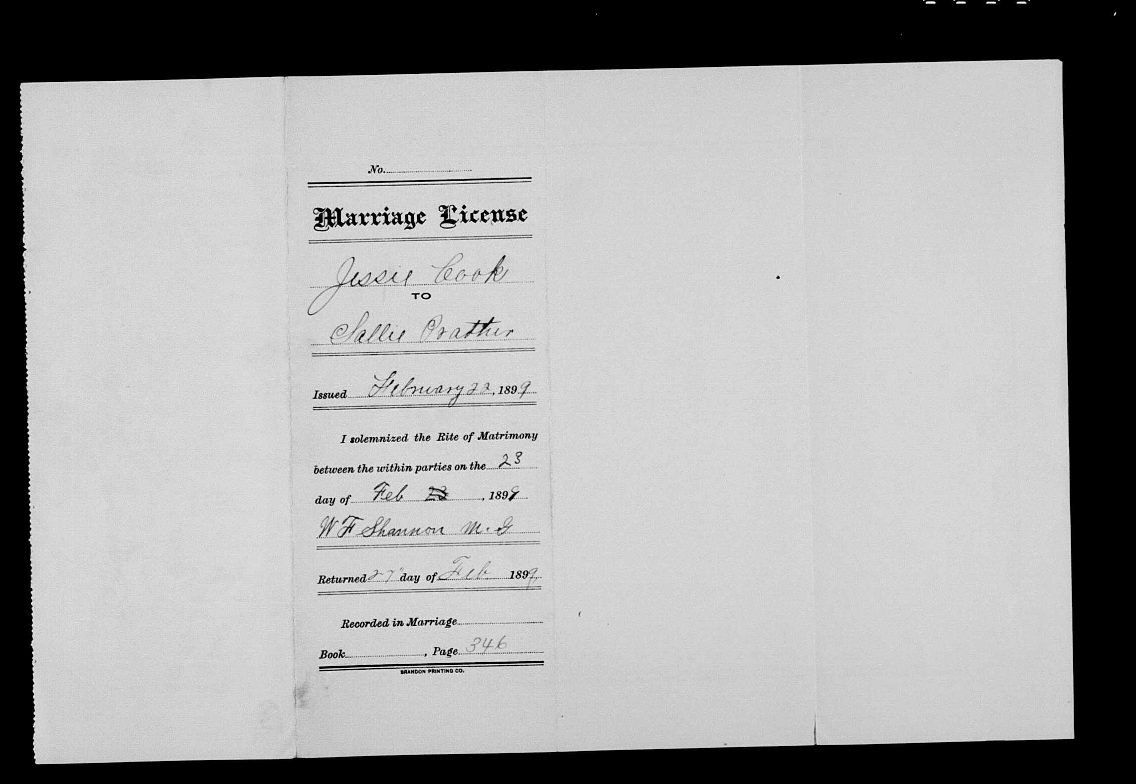 4214. Jessie Cook and Sallie Prather, “Tennessee Marriages, 179601950,” February 23, 1899, Robertson County, TN, USA, https://familysearch.org/ark:/61903/1:1:QK41-YPDB, https://familysearch.org/ark:/61903/1:1:QK41-YP6M.