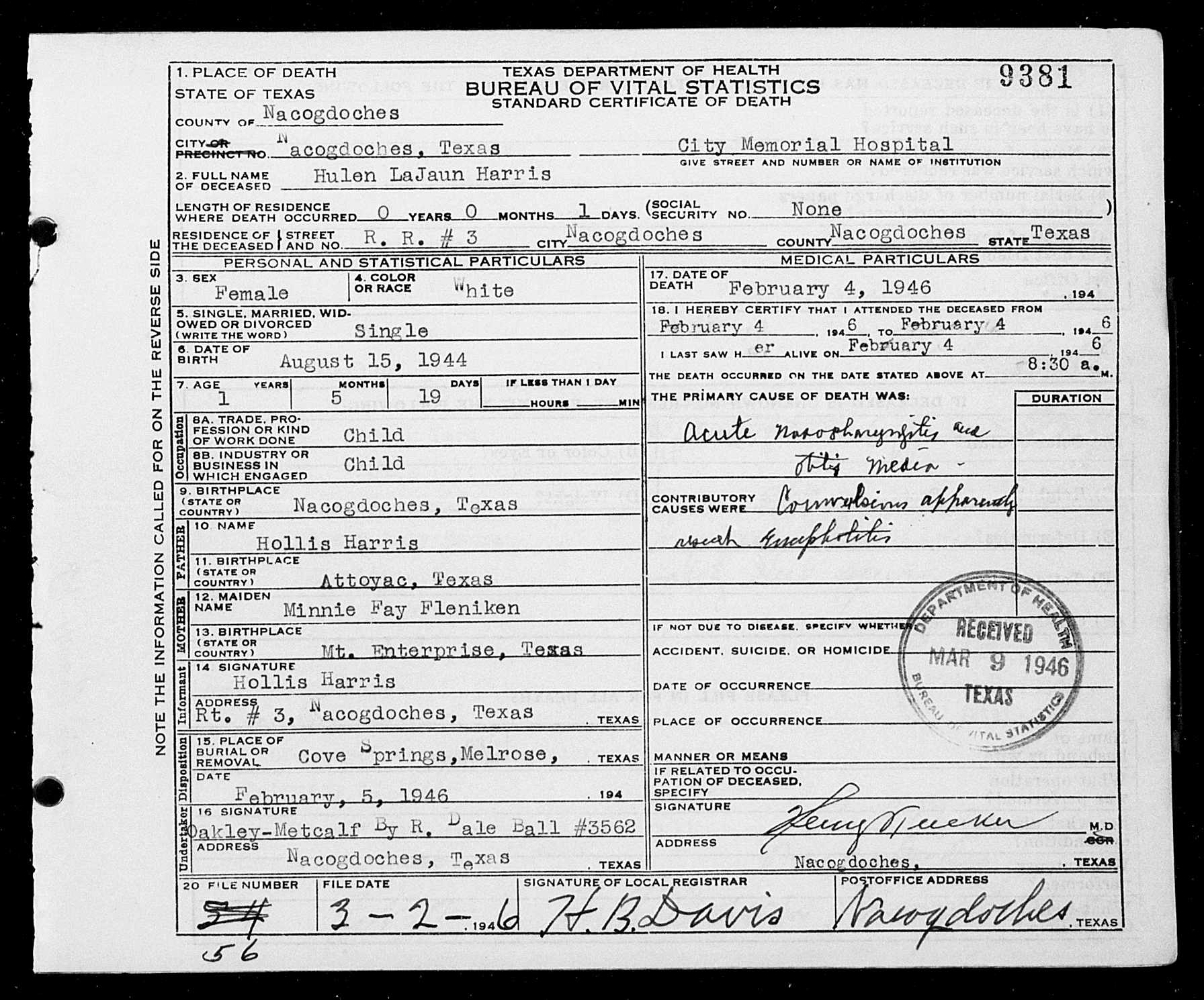 4223. Hulen LaJaun Harris, “Texas, Deaths, 1890-1976,” February 4, 1946, City Memorial Hospital, Nacogdoches, Nacogdoches County, TX, USA, GS Film number: 2218231 , Digital Folder Number: 005145022 , Image Number: 03104, https://familysearch.org/ark:/61903/1:1:K39J-C4B.