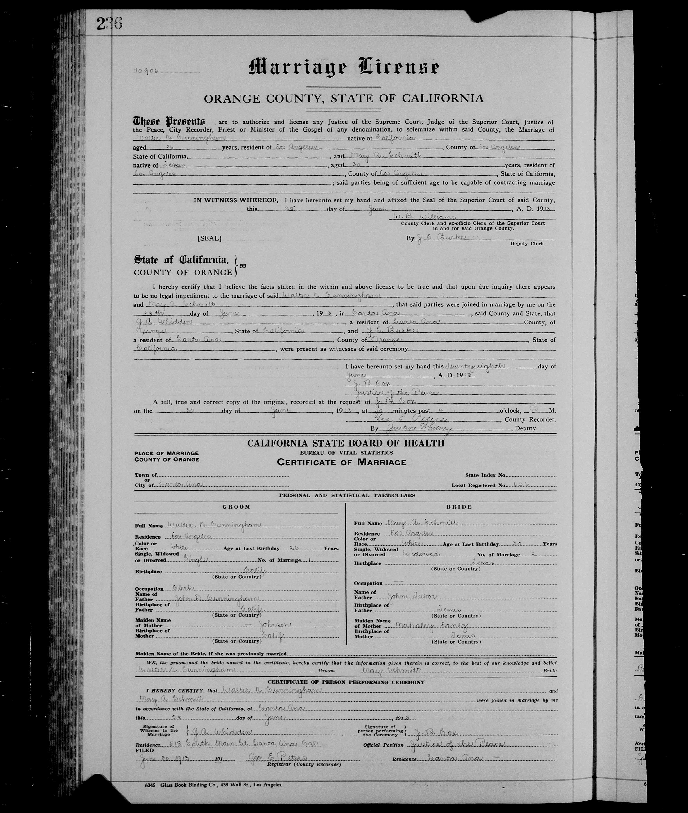 4369. “California, County Marriages, 1850-1952,” Walter N Cunningham and May A Schmitt, June 28, 1913, Santa Ana, Orange County, CA, 40905, page: 236-film number: 2050852-digital folder number: 005698124-image number: 00651, https://familysearch.org/pal:/MM9.1.1/K8XT-6PP.