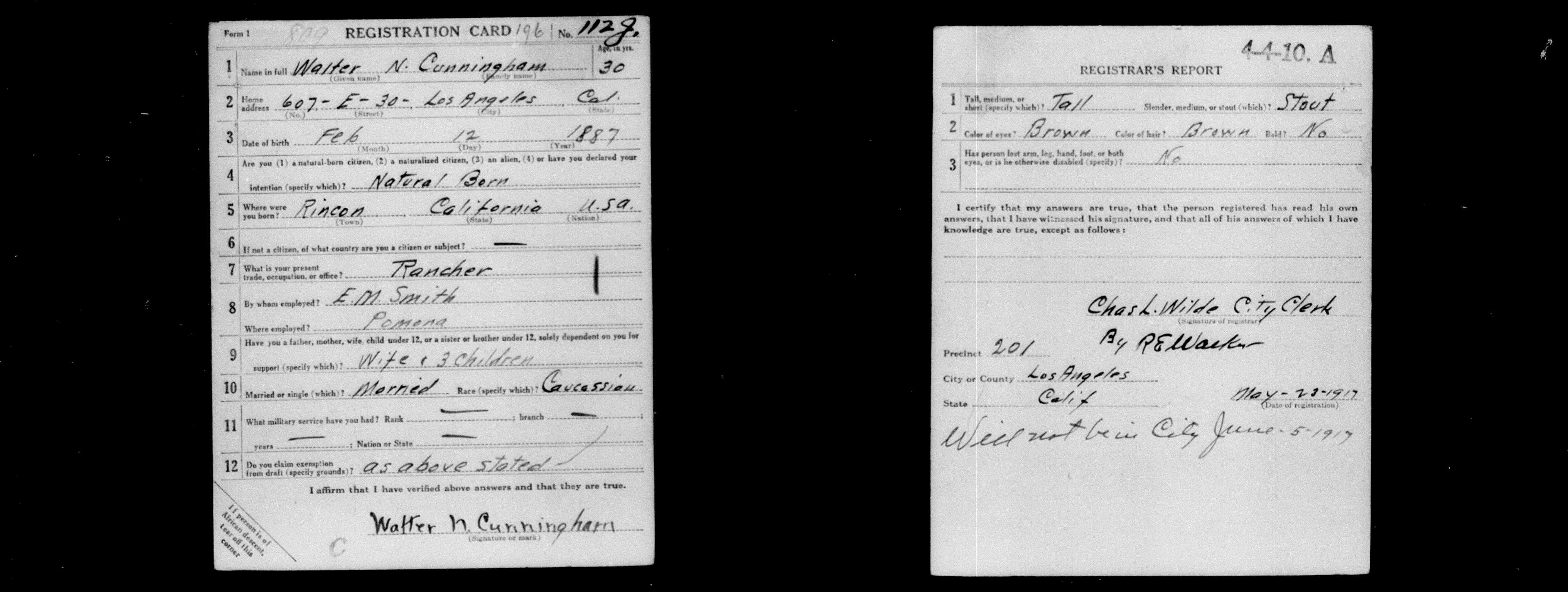 4371. World War I, 1917, California, 112J, Cunningham, Walter N, “World War I Selective Service System Draft Registration Cards,” May 23, 1917, Los Angeles, Los Angeles County, CA, nara publication number: M1509-film number: 1530895-digital folder number: 005240915-image number: 00454, https://familysearch.org/pal:/MM9.1.1/KZVX-BF6, Lists birth place as Rincoln, CA.