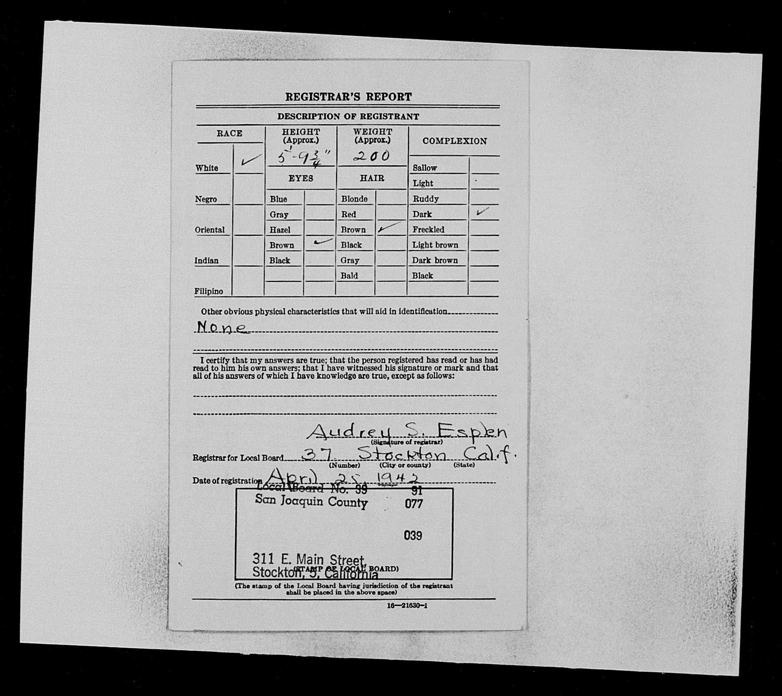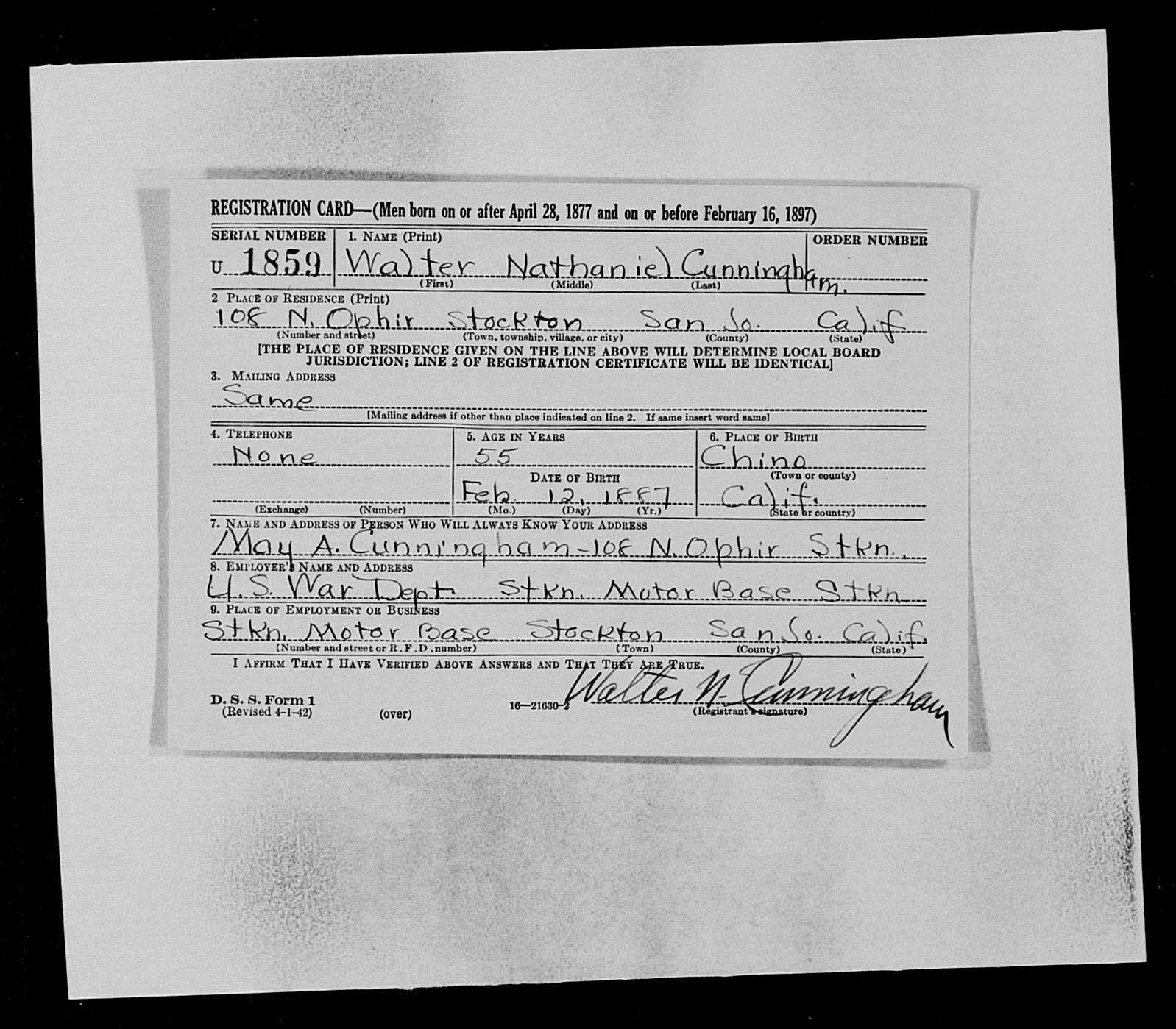 4372. World War II, 1942, California, U1859, Cunningham, Walter Nathaniel, “World War II Draft Cards (4th Registration) for the State of California,” April 25, 1942, Stockton, San Jose County, CA, arc identifier: 603155-film number: 1782630-digital folder number: 004669420-image number: 01099, https://familysearch.org/pal:/MM9.1.1/V4D3-JNG, Lists birth place as Chino, CA.