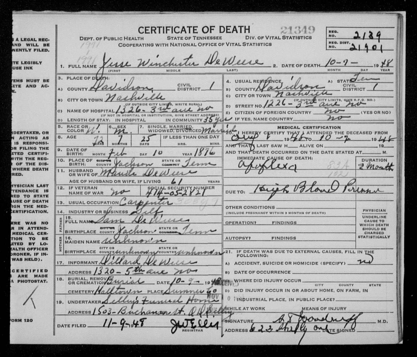 4389. Jesse Winchester DeWeese, “Tennessee Death Records, 1914-1955,” microfilm, digital folder number: 4184937-image number: 1614-film number: 2137401-volume/page/certificate number: cn 21349, https://familysearch.org/pal:/MM9.1.2/M14C-1PN/p2.