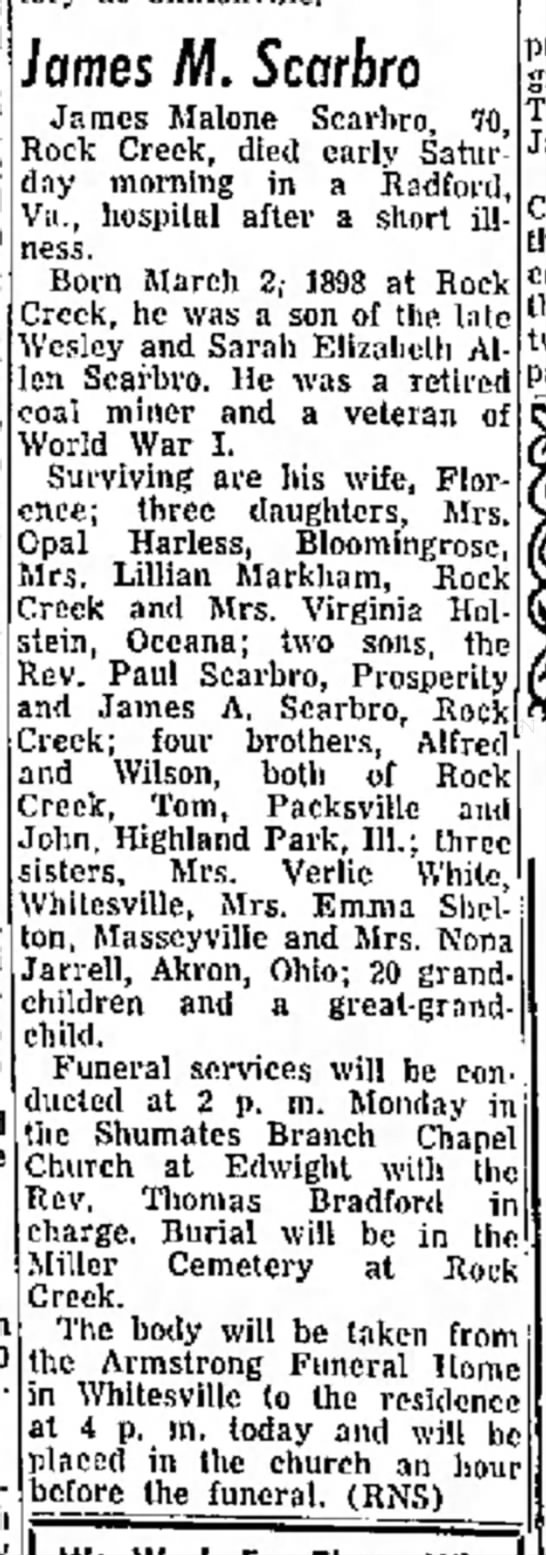 Surviving are his wife, Florence; three daughters, Mrs. Opal Harless, Bloomingrose, Mrs. Lillian Markham, Rock Creek and Mrs. Virginia Holstein, Oceana; two sons, the Rev. Paul Scarbro, Prosperity and James A. Scarbro, Rock Creek; four brothers, Alfred and Wilson, both of Rock Creek, Tom, Packsville and John, Highland Park, Ill.; three sisters, Mrs. Verlie White, Whitesville, Mrs. Emma Shelton, Masseyville and Mrs. Nona Jarrell, Akron, Ohio; 20 grandchildren and a great-grandchild.