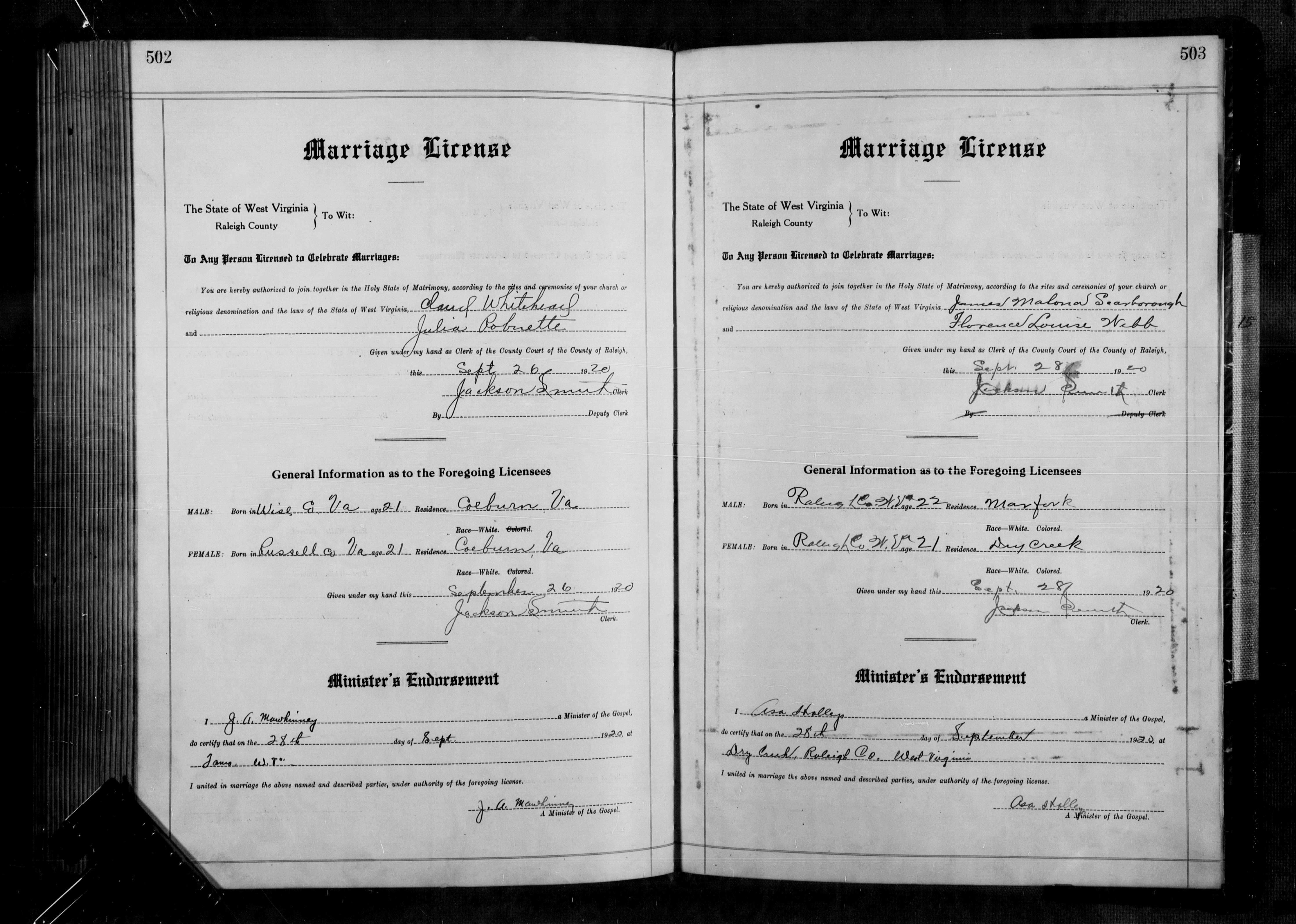 4904. James Malona Scarborough and Florence Louise Webb, “West Virginia Marriages, 1780-1970,” September 28, 1920, Dry Creek, Raleigh County, WV, https://familysearch.org/ark:/61903/1:1:FT26-22V.