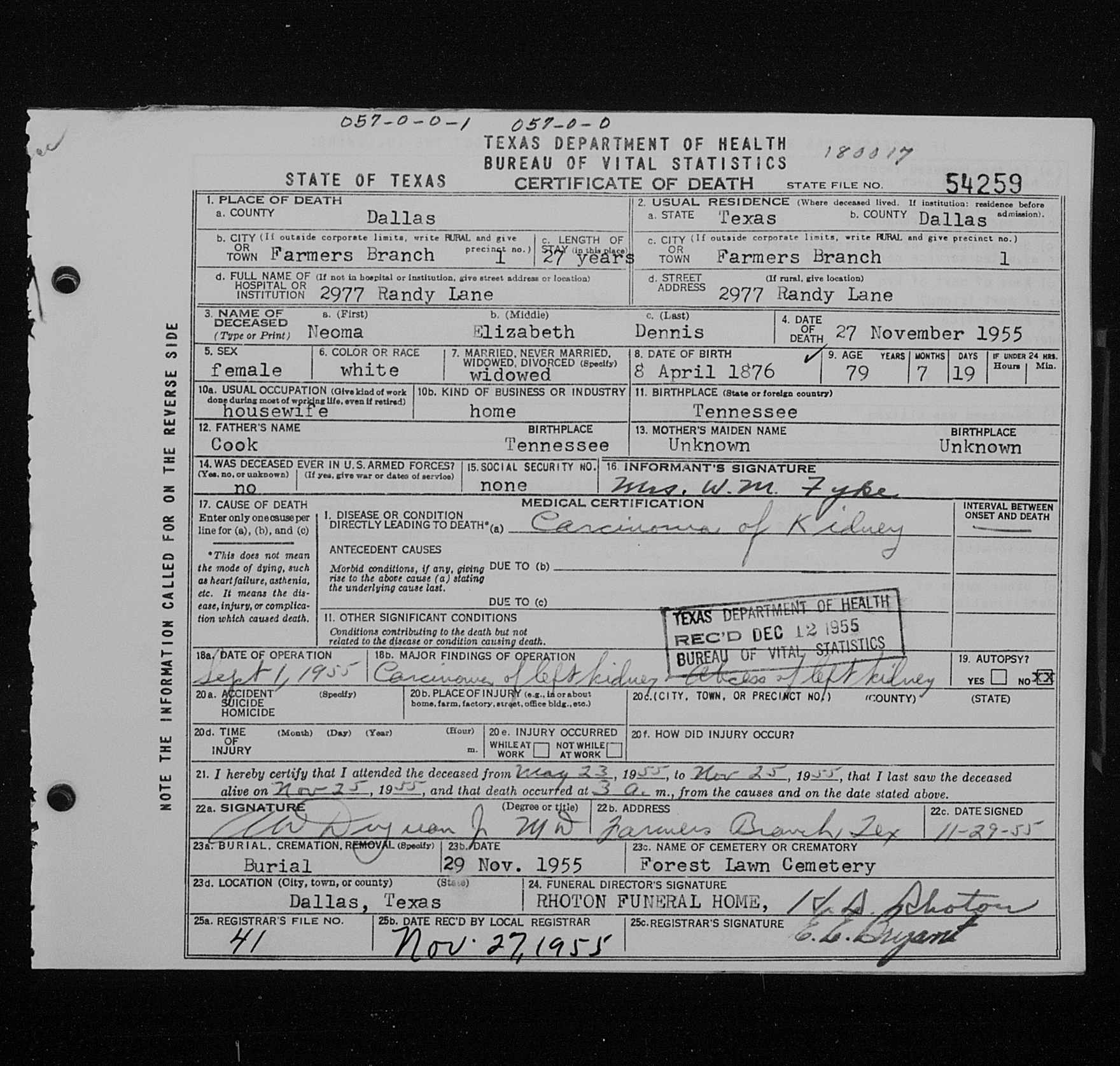 4918. Neoma Elizabeth Dennis, “Texas Deaths, 1890-1976,” November 27, 1955, Farmers Branch, Dallas County, TX, https://familysearch.org/ark:/61903/1:1:K3Q6-176.