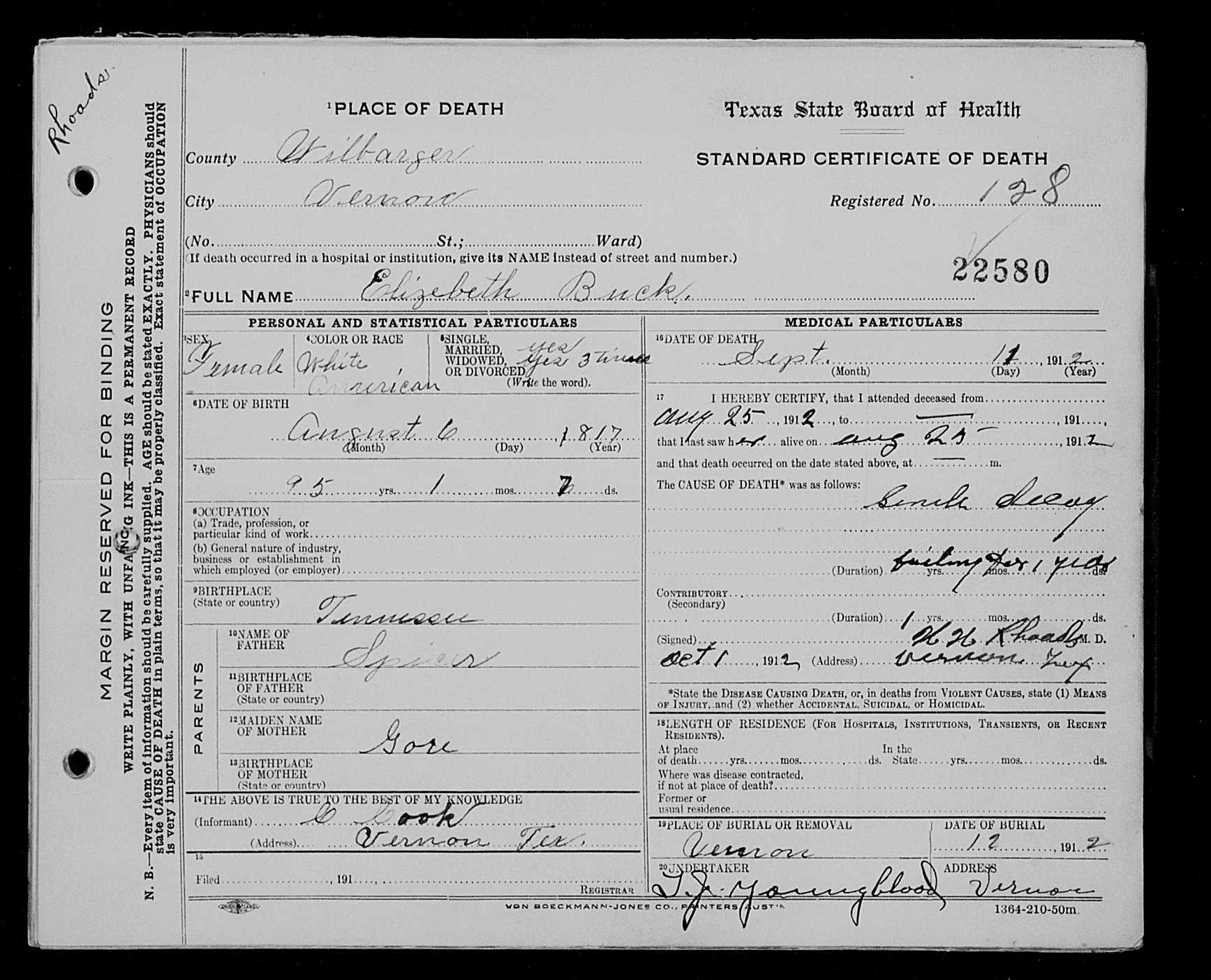 4928. Elizabeth Buck, “Texas Deaths, 1890-1976,” September 11, 1912, Vernon, Wilbarger County, TX, https://www.familysearch.org/ark:/61903/1:1:K3WR-MT4.