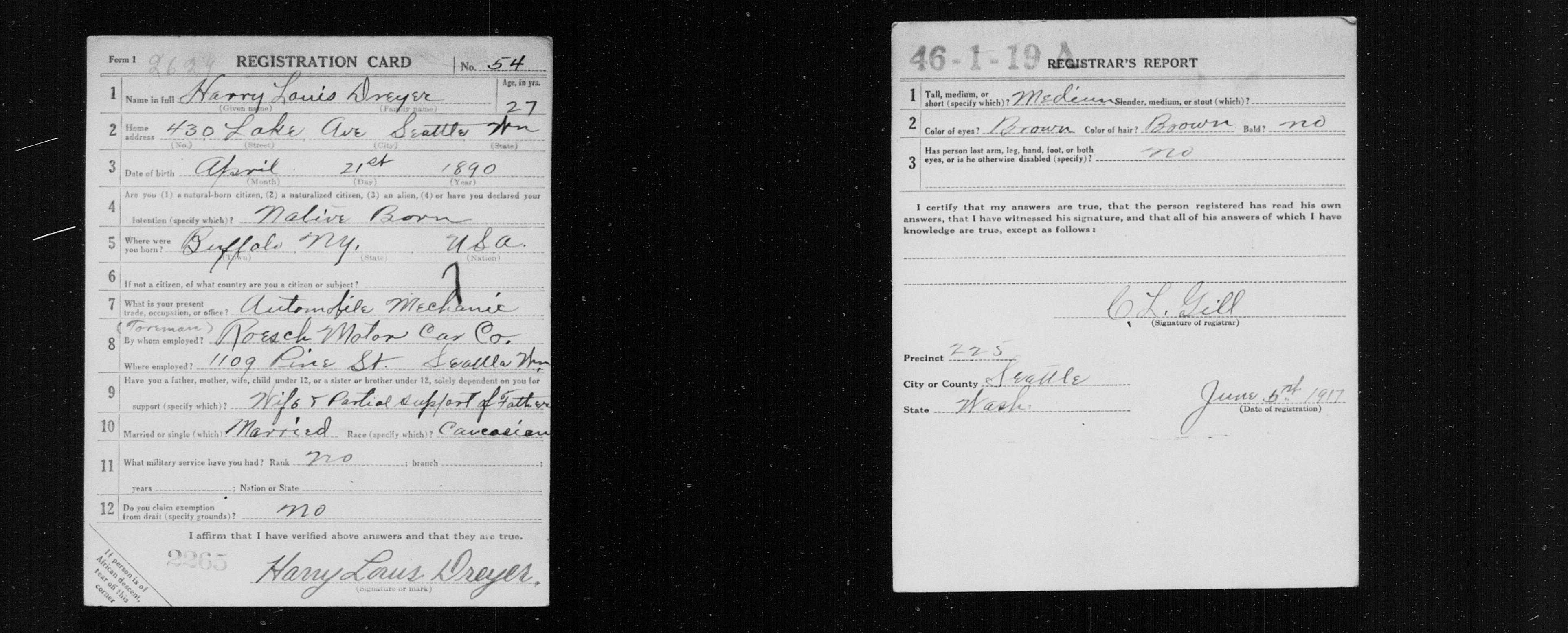 5057. World War I, 1918, Washington, 54, Dreyer, Harry Louis, “World War I Selective Service System Draft Registration Cards,” June 5, 1918, Seattle, WA, https://familysearch.org/ark:/61903/1:1:QJDG-4G76.
