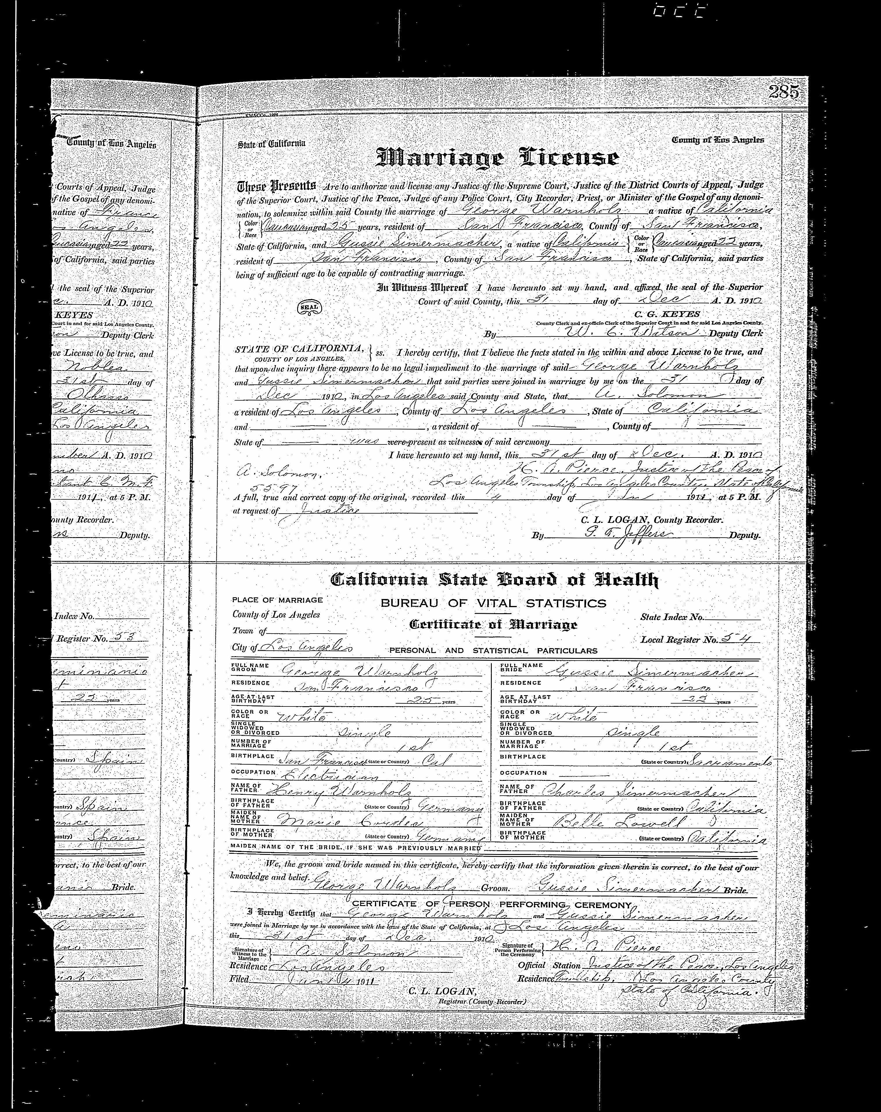 5065. George Warnholz and Gussie Simermacher, “California, County Marriages, 1850-1952,” December 31, 1910, Los Angeles, CA, GS Film number: 2074036 , Digital Folder Number: 004280662 , Image Number: 00626, https://familysearch.org/ark:/61903/1:1:K8ZK-GDK.