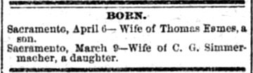 5061. “Born,” Simmermacher, The Record-Union, Sacramento, CA, April 12, 1887, 3.