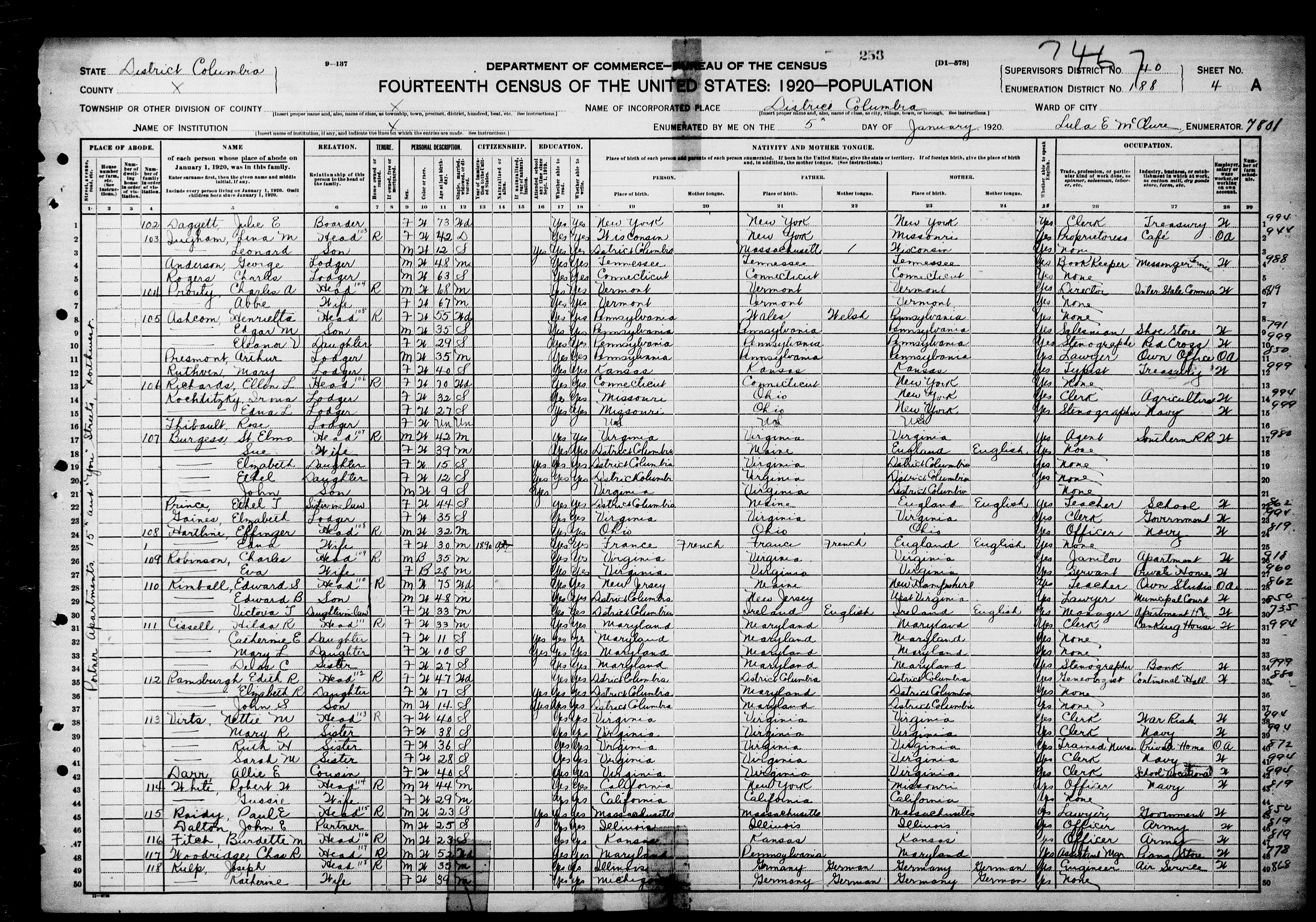 5064. “United States Census,” 1920, DC, Washington, Washington, 4A, 40, 188, T625, 1820210, 7467, 1091, Bureau of the Census, US Dept. of Commerce, United States of America, January 5, 1920, Lula E McClure.