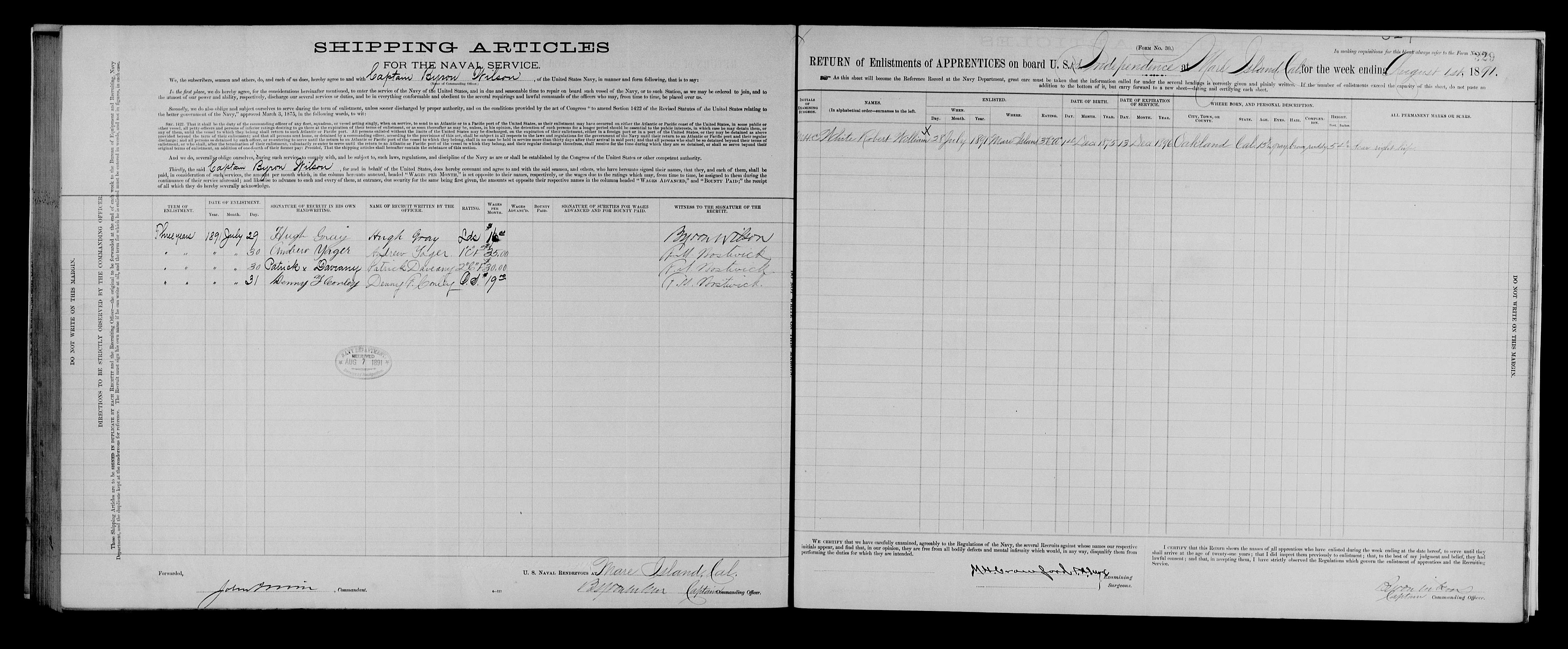 5069. Robert William White, “United States Naval Enlistment Rendezvous, 1855-1891,” July 28, 1891, Mare Island, CA, https://www.familysearch.org/ark:/61903/1:1:XG7Q-SQ7.