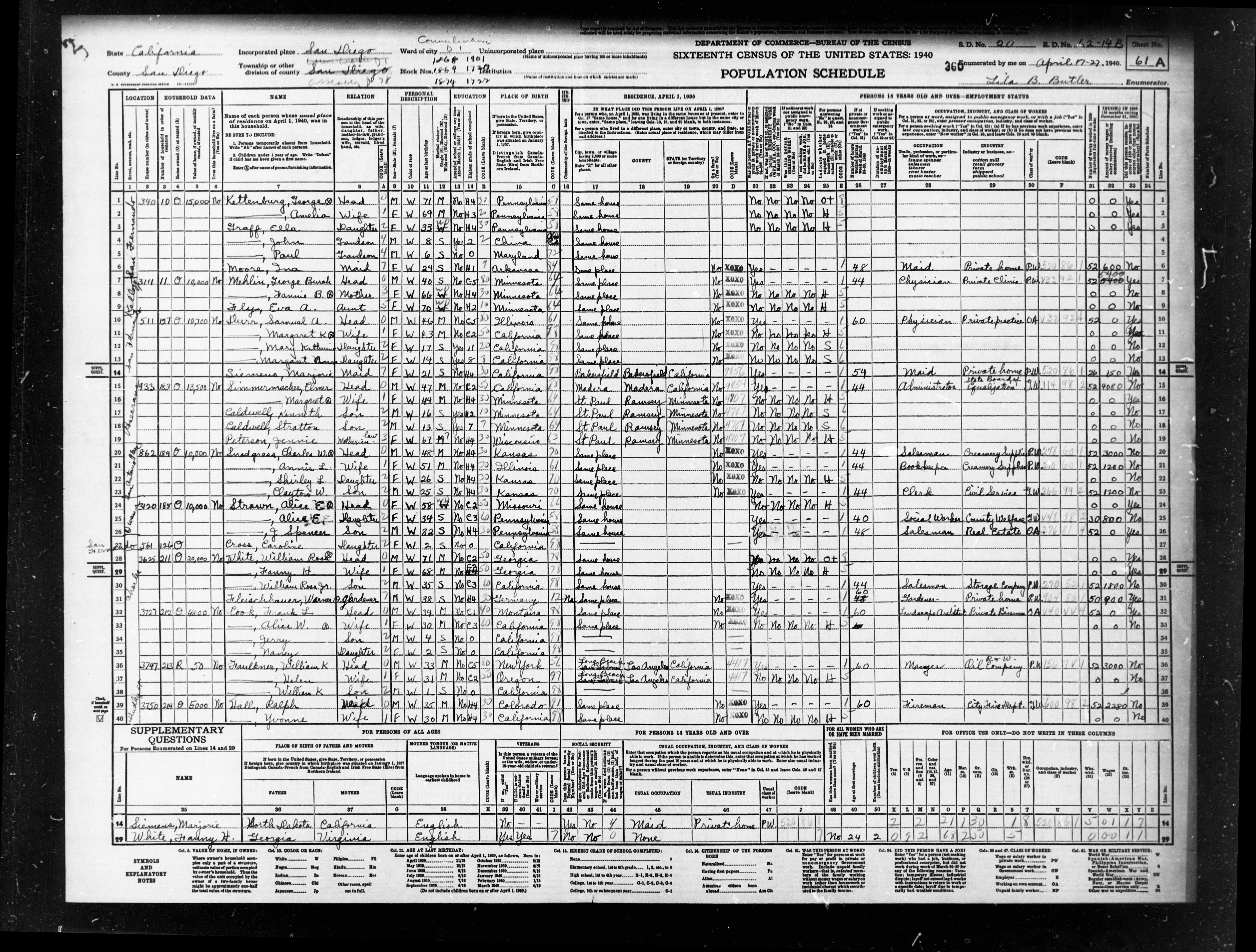 5077. “United States Census,” 1940, CA, San Diego, San Diego, Assembly District 78, 61A, 20, 62-14B, T627, 447, 724, Bureau of the Census, US Dept. of Commerce, United States of America, April 17, 1940, Lila B Butler.