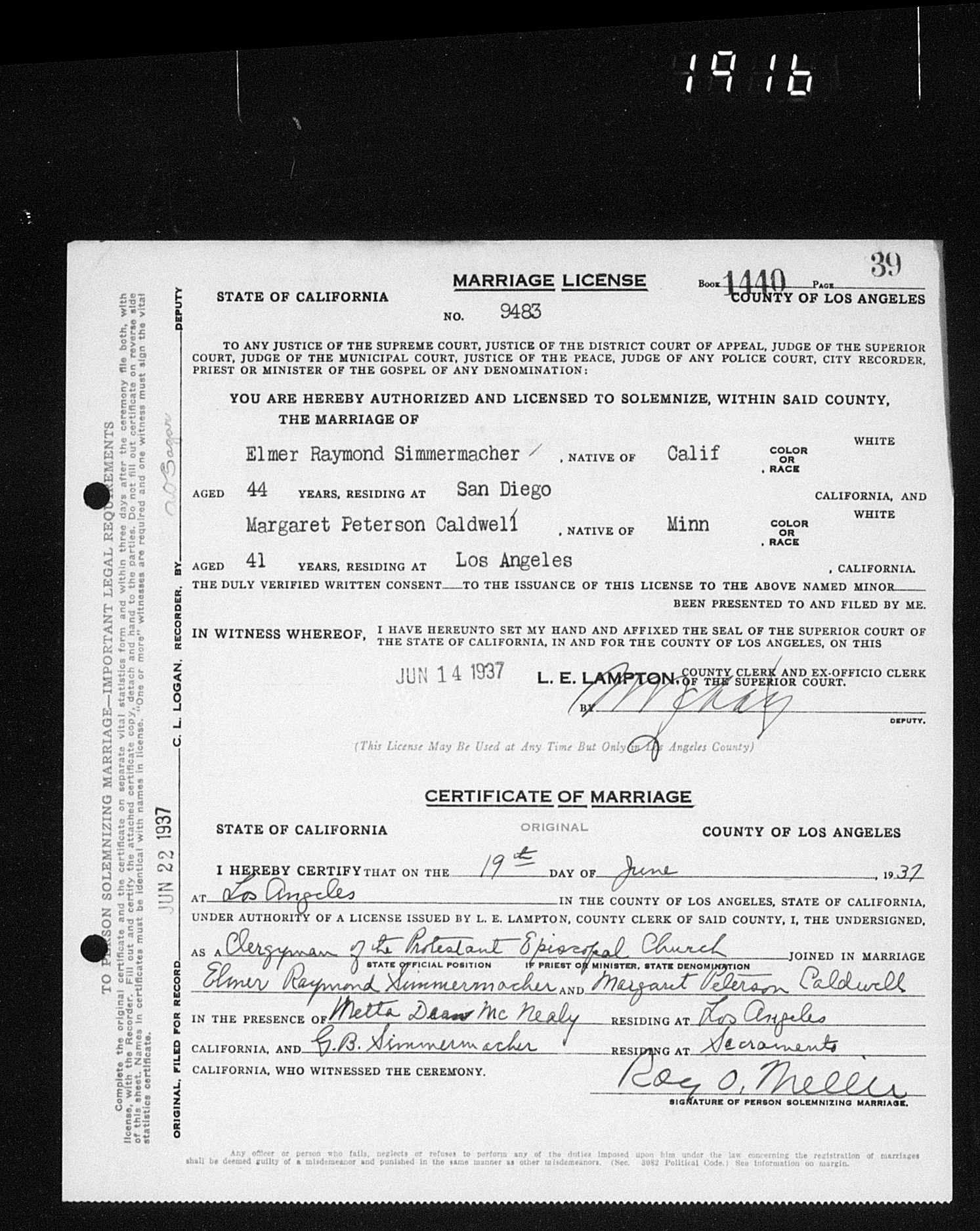 5078. Elmer Raymond Simmermacher and Margaret Peterson Caldwell, “California, County Marriages, 1850-1952,” June 19, 1937, Los Angeles, Los Angeles County, CA, USA, Page: 39-GS Film number: 2114023-Digital Folder Number: 005698599-Image Number: 01902, https://familysearch.org/pal:/MM9.1.1/K8JB-J5V.