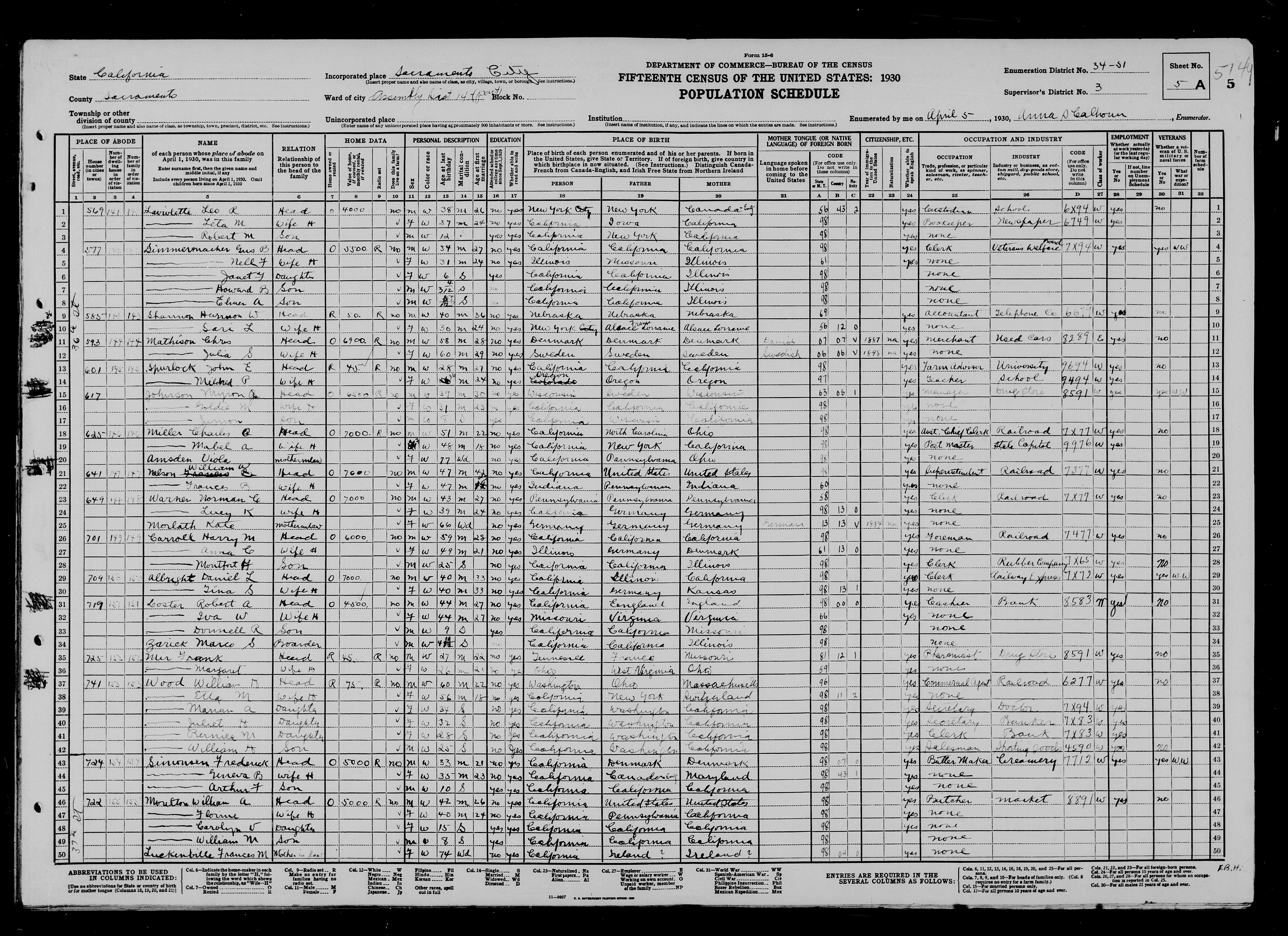5085. “United States Census,” 1930, CA, Sacramento, Sacramento, Assembly District 14, 5A, 3, 34-51, T626, 186, 15, Bureau of the Census, US Dept. of Commerce, United States of America, April 5, 1930, Anna S Calhoun.