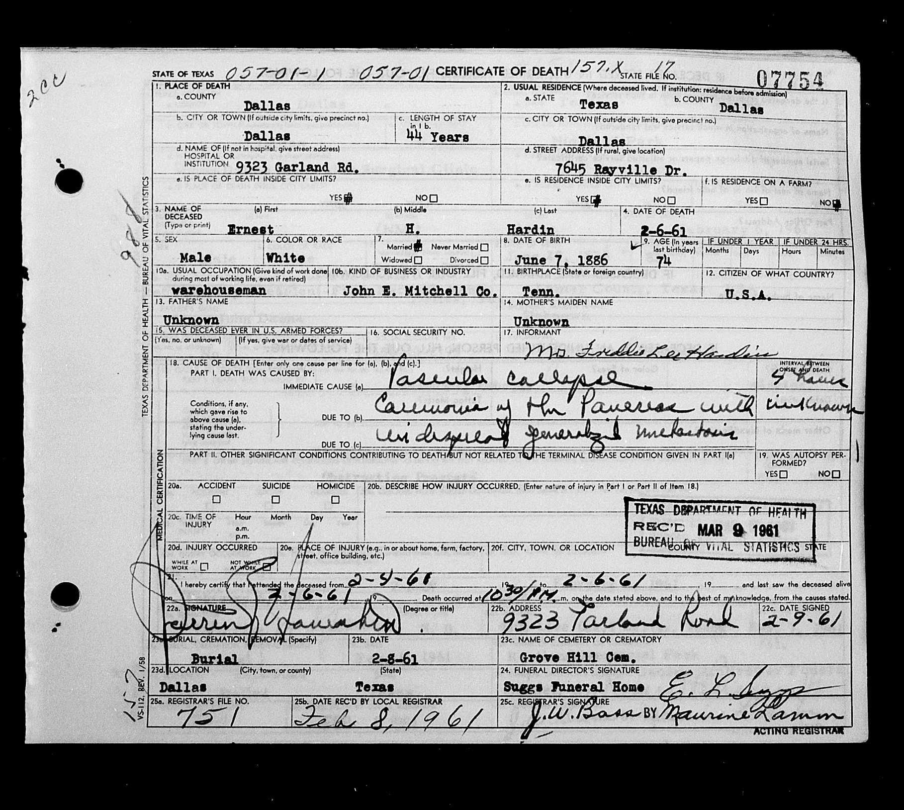 5100. Ernest H Hardin, “Texas, Deaths, 1890-1976,” February 6, 1961, Dallas, Dallas County, TX, USA, Certificate Number: 7754, GS Film number: 2116709 , Digital Folder Number: 005145510 , Image Number: 00988, https://familysearch.org/pal:/MM9.1.1/K3H9-F9G.