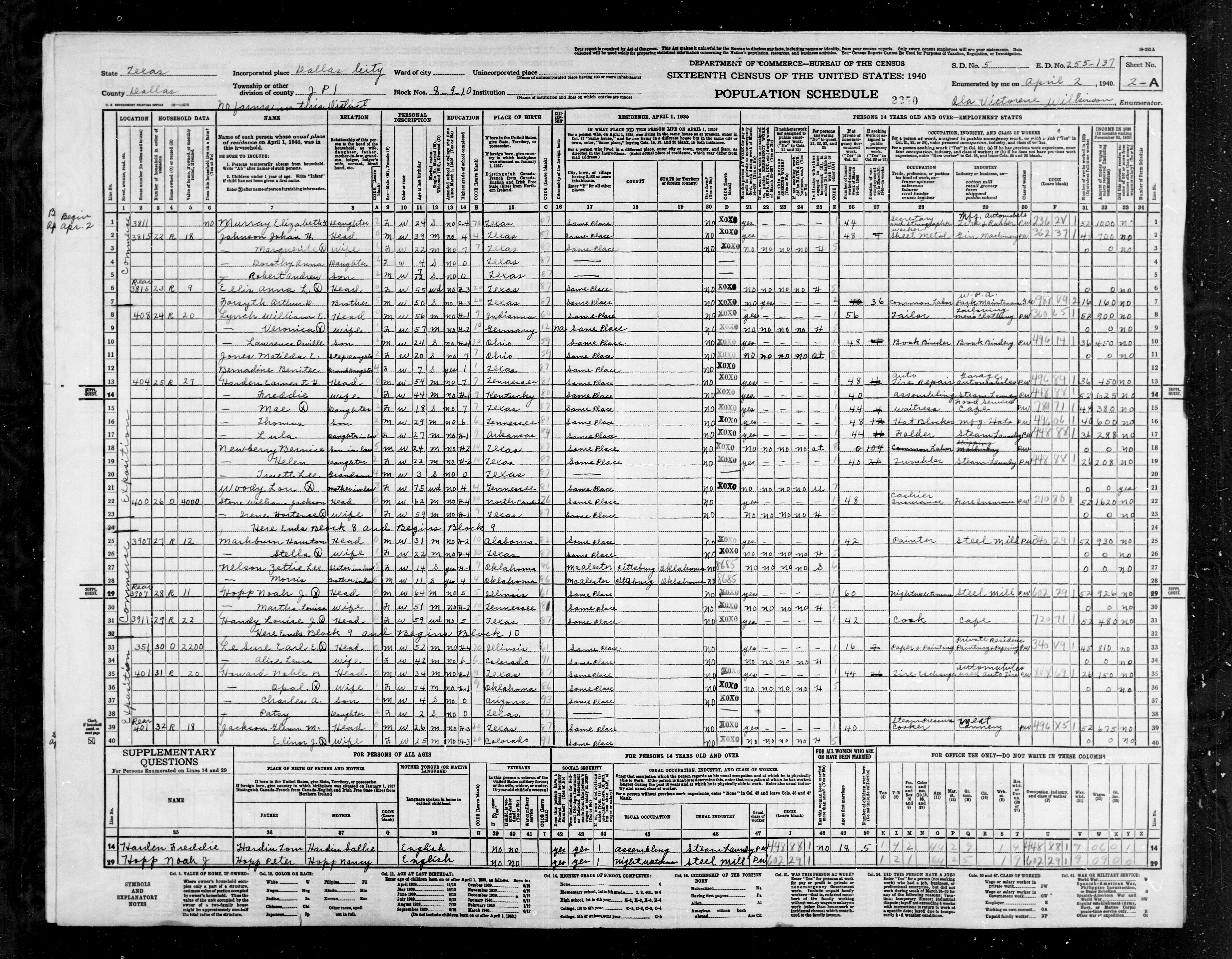 5103. “United States Census: 1940,” Bureau of the Census, US Dept. of Commerce, United States of America, 1940, TX, Dallas, Dallas, Precinct 1, Tract 30, 2A, 255-137, T627, 4176, 866.