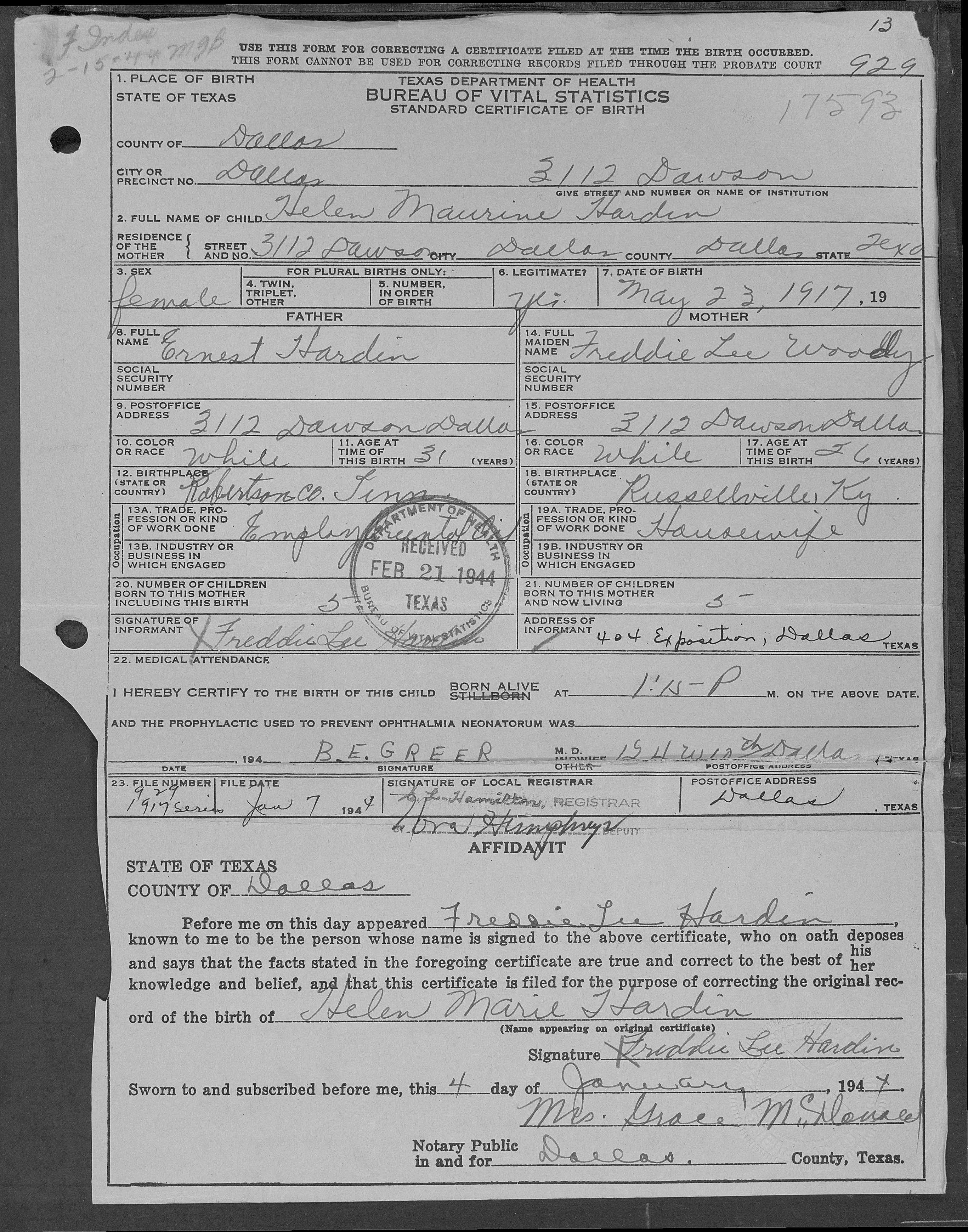 5106. Helen Maurine Hardin, “Texas, Birth Certificates, 1903-1935,” May 23, 1917, Dallas, Dallas County, TX, USA, Certificate Number: 17593 , Digital Folder Number: 004491061 , Image Number: 00027, https://familysearch.org/pal:/MM9.1.1/X2JQ-XQK.