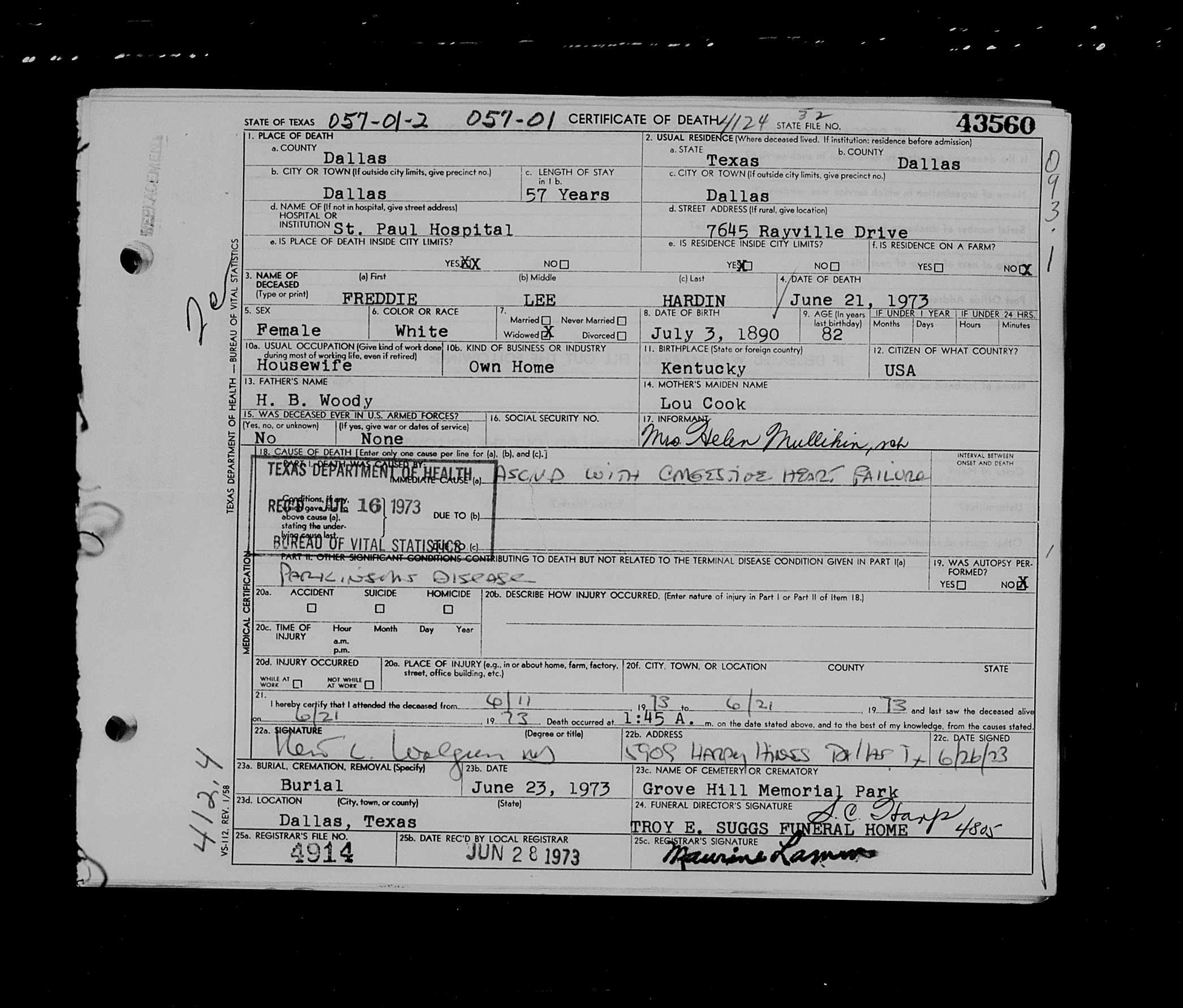 5107. Freddie Lee Hardin, “Texas, Deaths, 1890-1976,” June 21, 1973, Dallas, Dallas County, TX, USA, Certificate Number: 43560, GS Film number: 2242784 , Digital Folder Number: 005145736 , Image Number: 02124, https://familysearch.org/pal:/MM9.1.1/K38J-7XY.